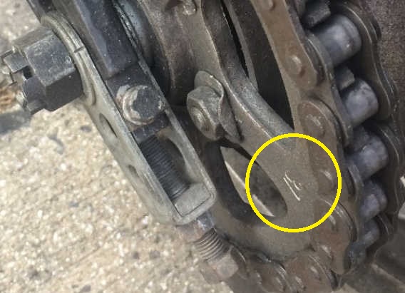 However, installing the larger 39 tooth sprocket would likely cause the chain to contact the shocks even more. That makes me believe that a spacer may be turned the wrong way around or installed in the wrong spot. Also, notice in the 3rd image below the sprocket nuts are running way too close to the lower shock mount bolt. The 4th image below shows the spacer on my KZ650-C1. You can see there is a bit more of it between the sprocket and swing arm than on your bike.