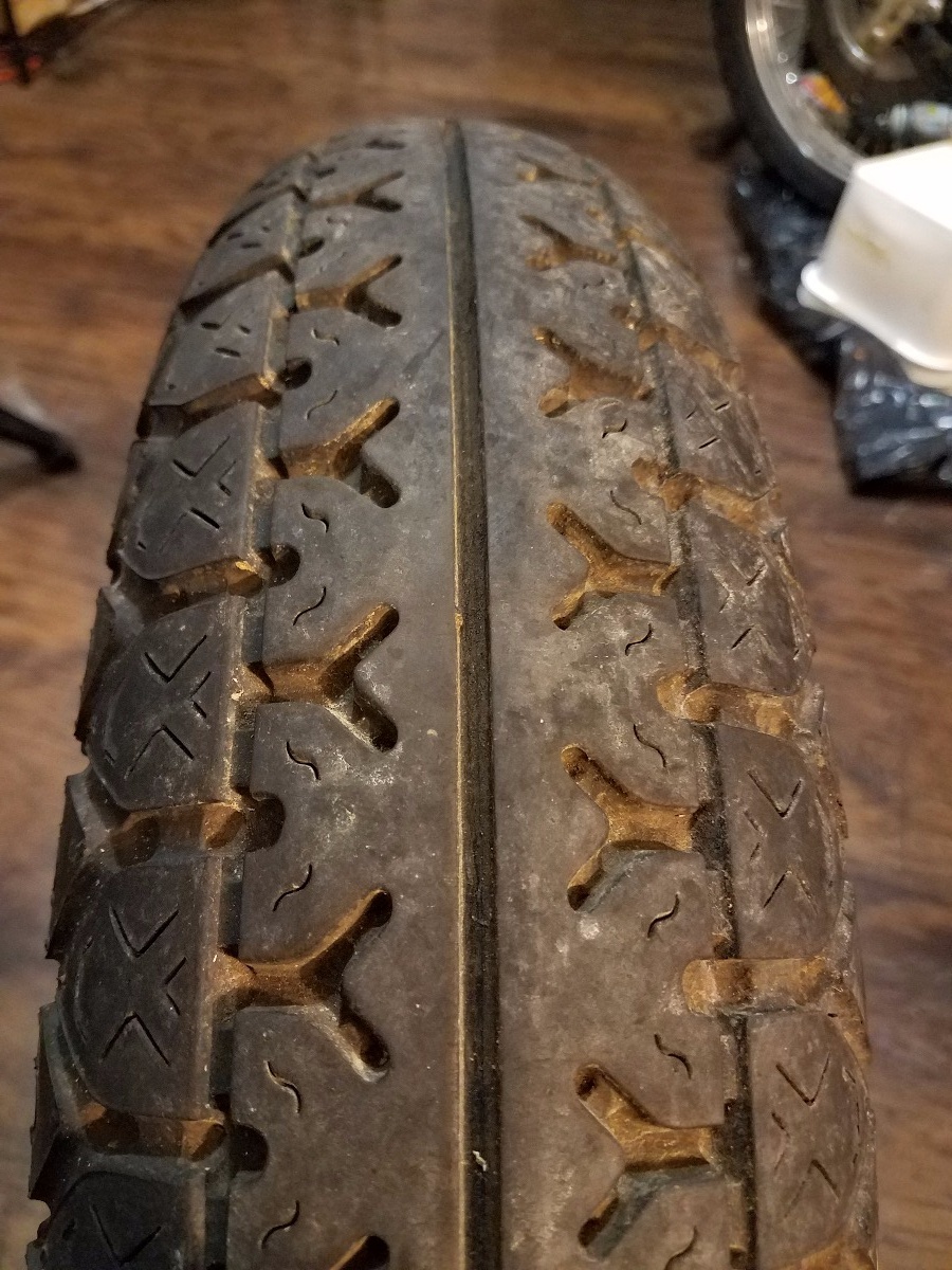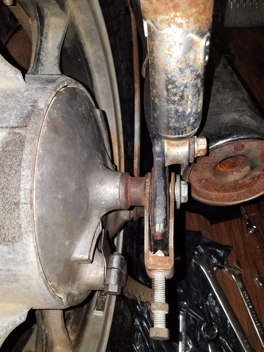That is where I was trying to put it but it would not fit in but I will take it apart and put it in correctly. You are right there is 2 washer and the axles adjustment nut that is turned down. I will put the castle nut on the right side. There is new brake shoes in the rear. The pads had rusted to the hub and when I took it apart it separated the shoe from the lining. I am slowly going through everything and replacing what is stuck, rusted or just looks really scary. As soon as I get some time I am going to start a build post . The bike sat up so long the rear tire was discontinued and they just started reproducing it. It is a continental mt90 16t k112.