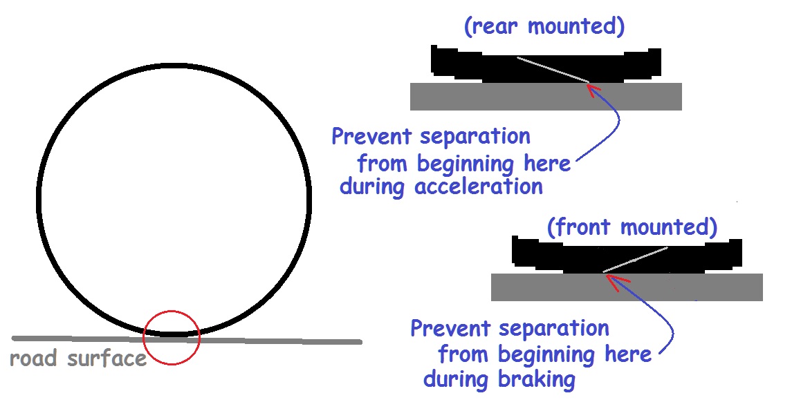 I believe, but am not positive, that when manufactured, the area where the tread connects is an overlapping area that best resists separation from acceleration force in one direction (on the rear) and best resists separation from braking force in the other direction (on the front). This refers to pressure applied to the tread connection area by the road surface during acceleration or braking.