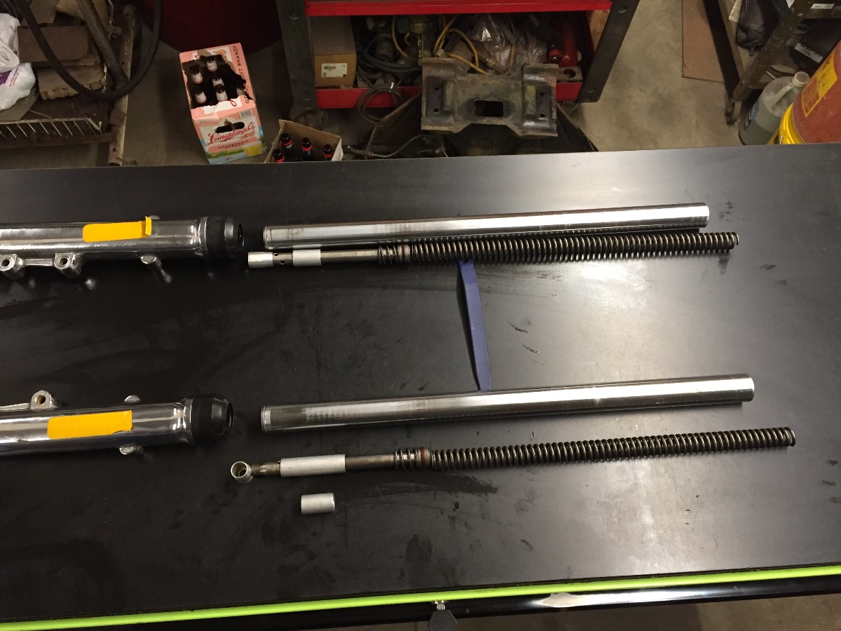 The lower fork assembly shows the 3" spacer comparison to the shortened spacer. Which is now 1.5". Spacer goes on the piston rod then the rebound spring goes on. Opposite of how it looks right now. Then everything goes right back the way it was disassembled. Shorten the spring the same amount that your spacer is. Fill with correct amount of oil and your done. The whole job could be done on the bike. Leave the tubes in the triple tree. Now would be a good time to check the steering stem bearings.... or update to tapered roller bearings if it hasn't been done. They are a good investment. I would not recommend going any lower than 1.5". The ride quality goes right down the drain.
