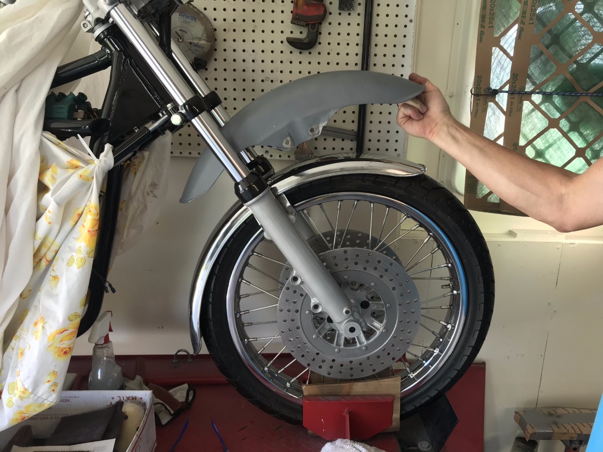 Here is the 78 KZ400 fender bolted on to the KZ900/1000 forks. This is a 19" wheel with a smaller 90/90 tire.
