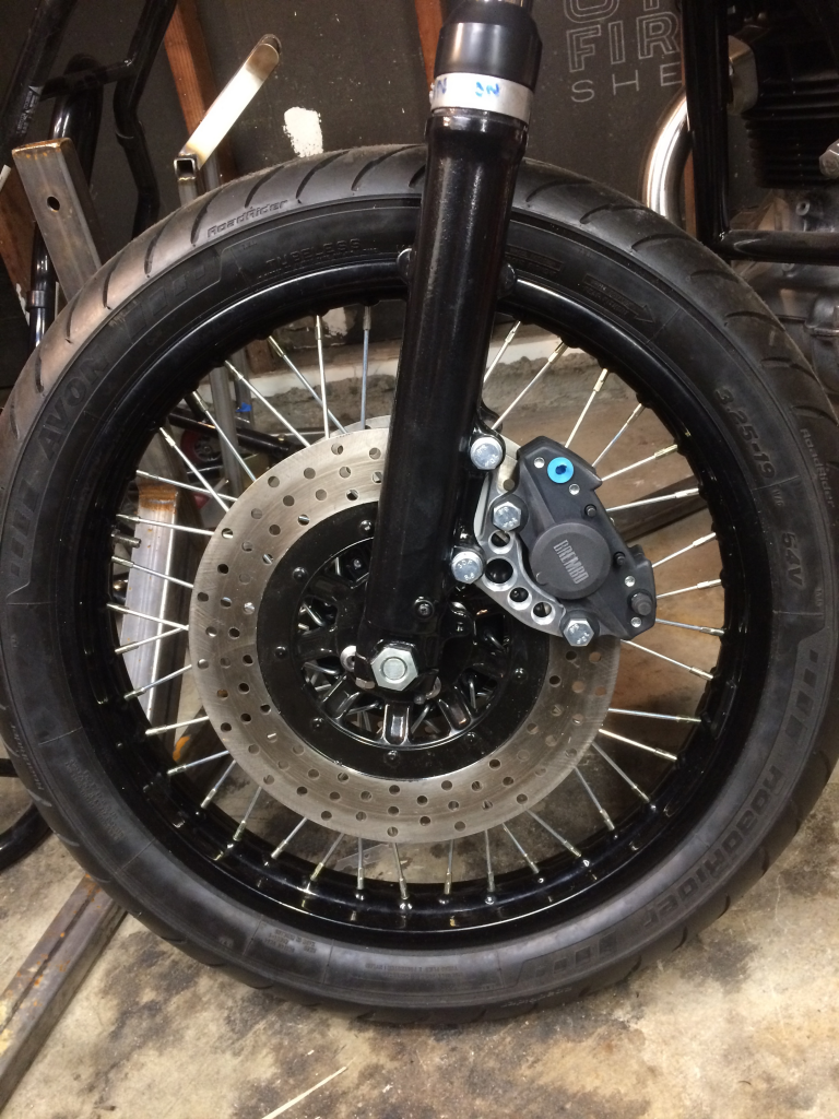 PM me your email, I think I still have the CAD drawing for the bracket. You will also need a spacer for the disk. And I just remembered I removed about 8mm from the inside of the caliper mounts on the lower fork tubes. It's not a bolt and go scenario but any semi-competent machinist should be able to make it work. Edit: i mostly removed the material from the forks so that I could mount the bracket the the back of the caliper mounts because I preferred that aesthetic, but I believe PMC makes bolt on kits for the Lockheed/p108/ grimeca replicas