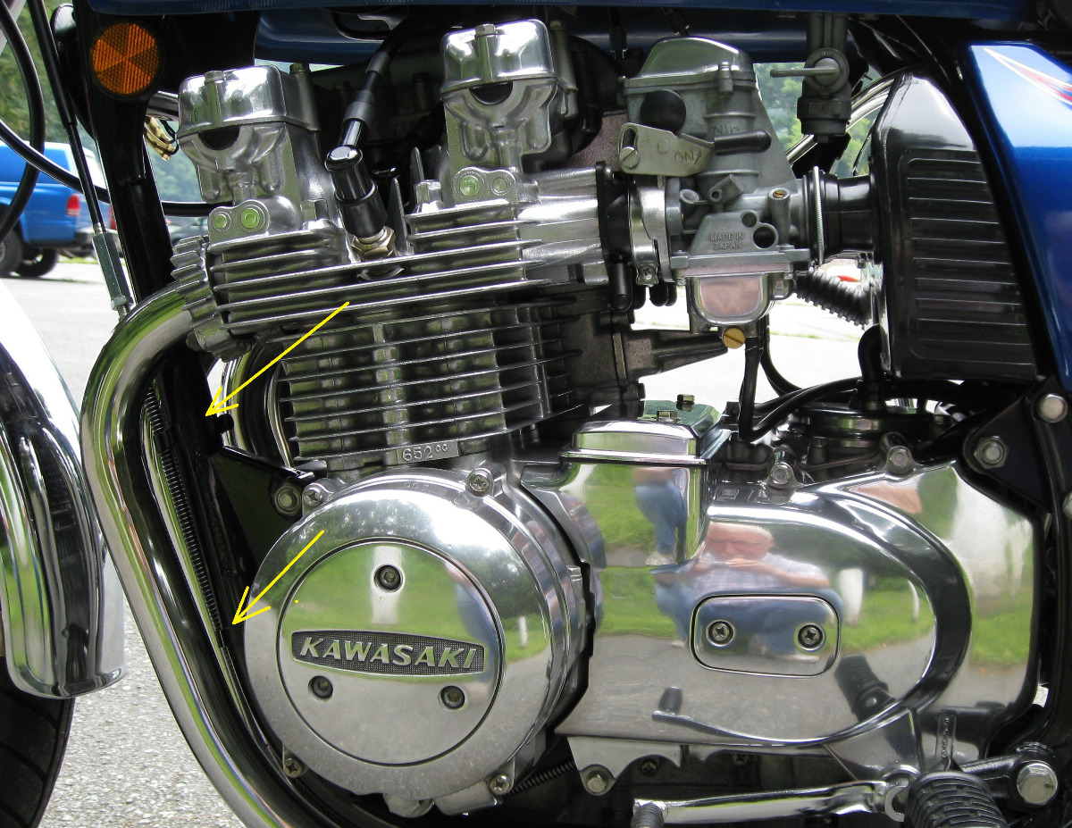 On my 1977 KZ650-C1 the clutch cable came routed on the outside of the frame as shown in the first image below. It is held close to the frame by 2 clamps (see 2nd and 3rd images below). Ed