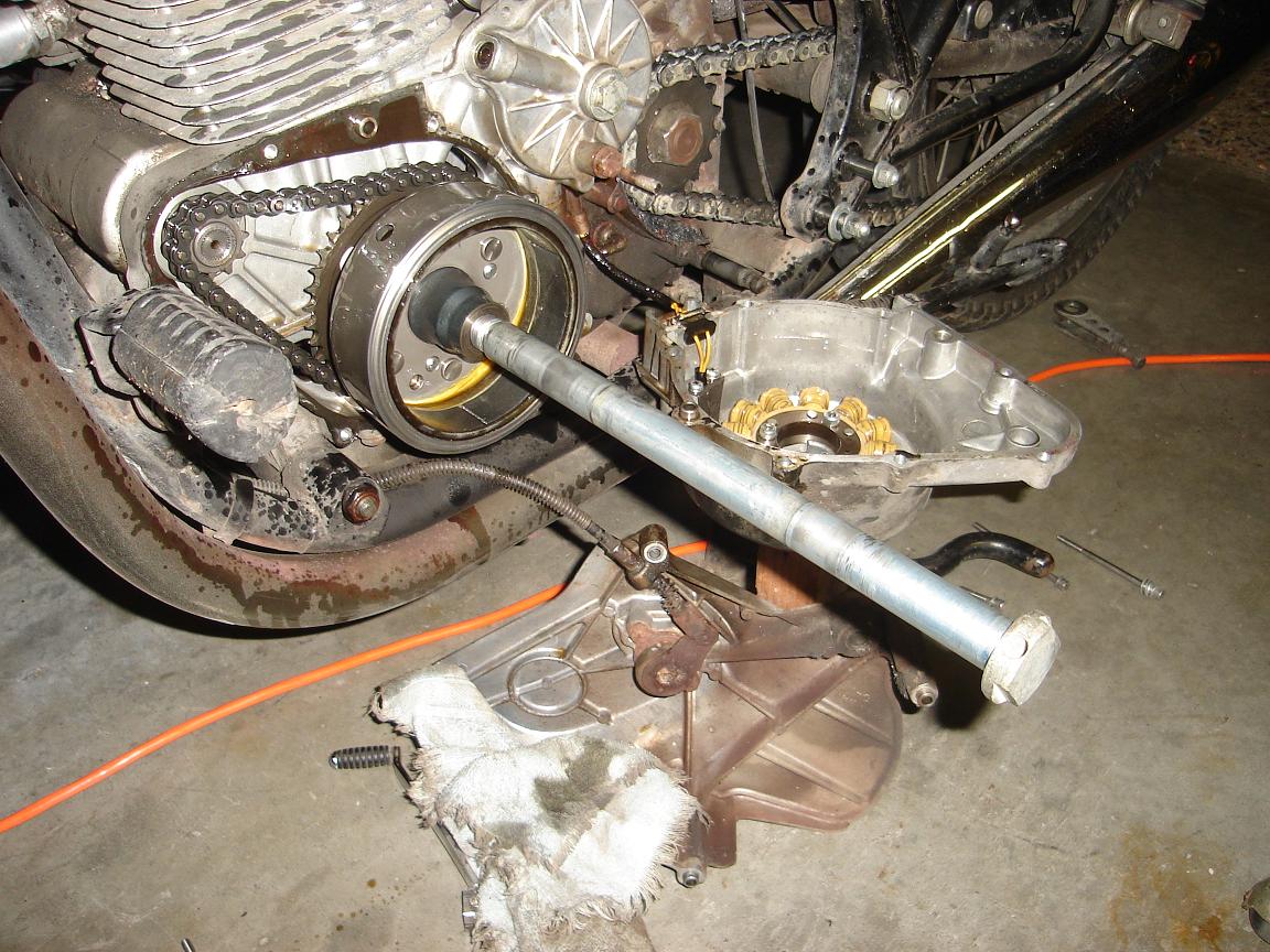 Jack, yes using the rear axle (note the adjuster on the floor by the rear tire) to remove the flywheel to rebuild the starter clutch. This was back in 2008.