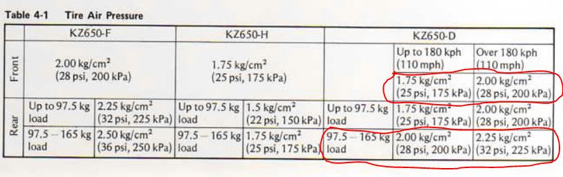 I have 1981 KZ650-D4, with 1981 z750L engine. with new tires. I have found a table in the service manual, please see attached table.