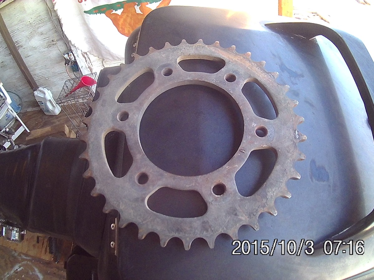 At least 10.000 miles on this one. First a NOS O ring chain, when it developed tight spots a new Gold high performance O ring chain (made in china) then a standard 630 chain until I could afford a whole new setup. See any misalignment marks or undue wear?