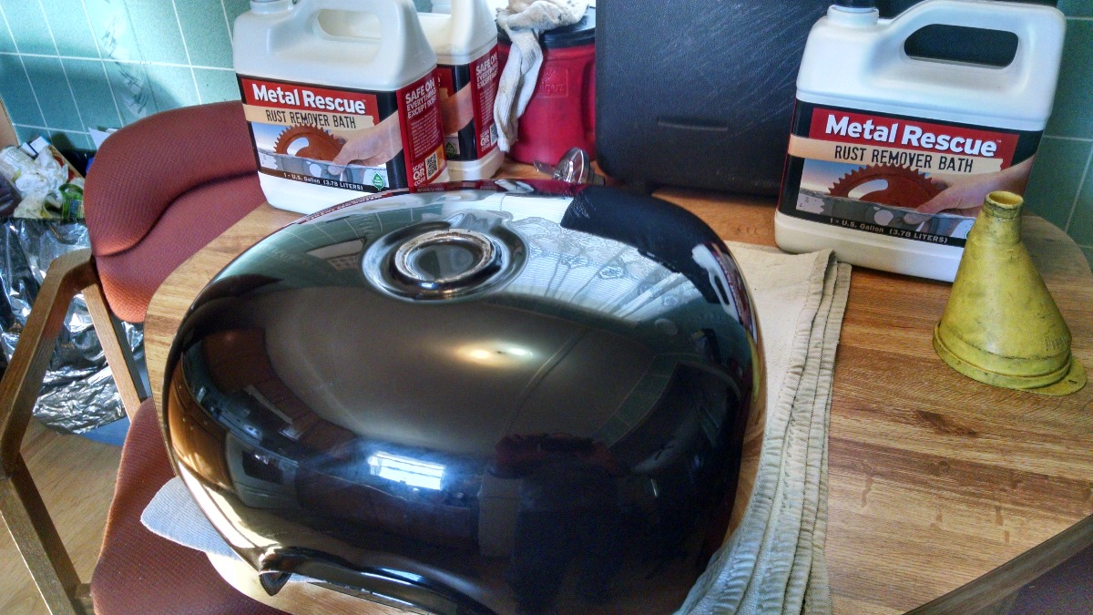 I have also used electrolysis too, and while it does work, it produces toxic gasses and "hydrogenates" the steel and supposedly makes it brittle. Much like plating processes. It also takes the paint off if you submerge the tank in the solution.