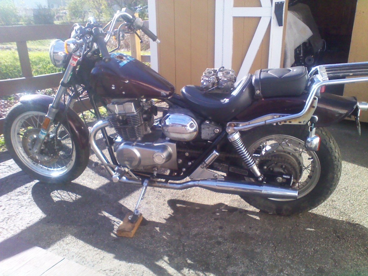 Another no title , no keys, locked up tight. Notice the carbs off.. this is how it sat outside for at least a year before I got it. He had a rag stuffed in the carb holders, but then it sat with nothing over it in the elements (was my neighbor). This was a nut and bolt rescue too. This pic was taken the day I got it. Notice the masking tape gas cap. There are some real rocket surgeons out there that own DEAD bikes.