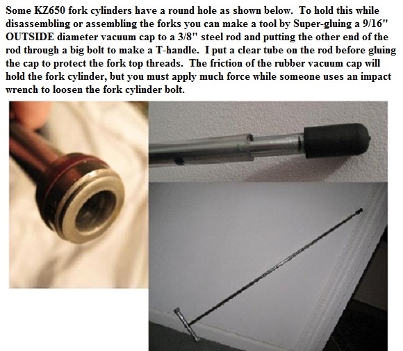 You will need to see whether your bike's fork cylinders have a hex depression or a round hole in their top end. If they have a round hole like the ones on my 1977 KZ650-C1 you may want to make a tool like the one I made (below). Another option if the fork cylinders have round holes is the "Damping Rod Holding Tool" at