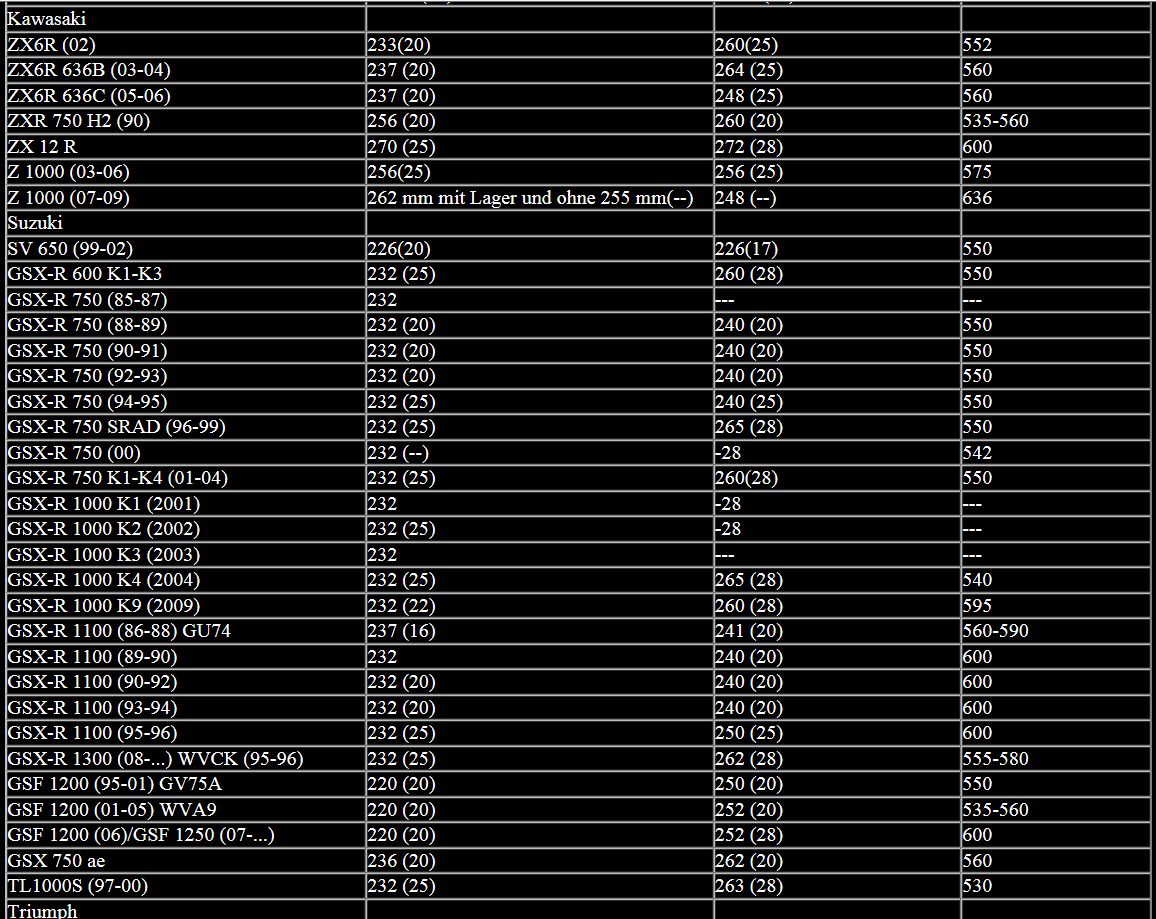 Here you will find a great Chart for your swing arm wheel opening/axle/pivot/frame width , forks, brake disks, rear suspension dimensions.