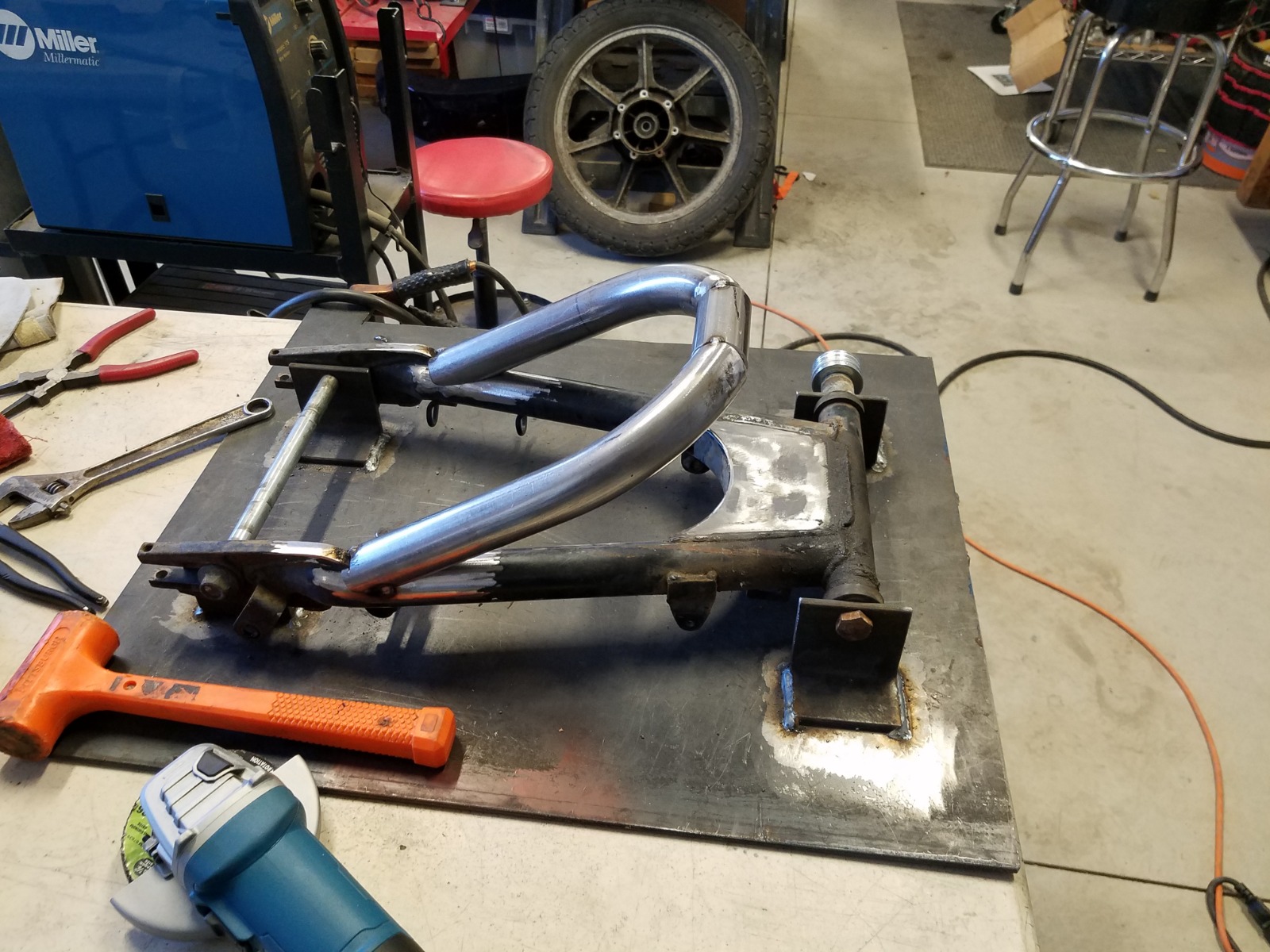I am currently doing a frame off resto-mod on an '81 KZ-750E myself. Going with a vintage Superbike theme. I decided to fabricate a tubular brace and weld it to the bottom of the stock swing arm. I made a weld fixture, and have the tubing bent, but haven't gotten any further with it yet.
