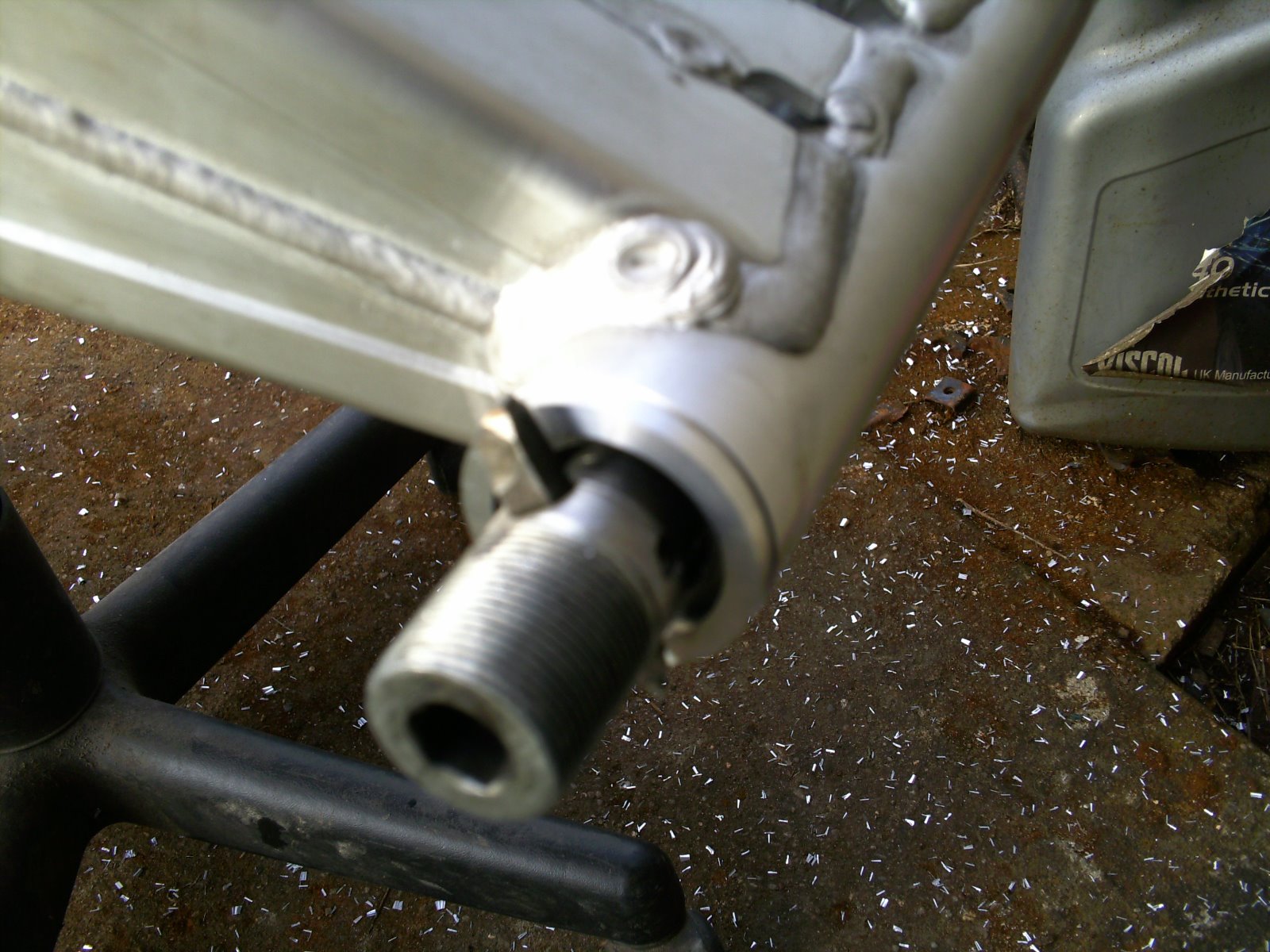 I didn't pay mush attention to this thread as I don't see myself ever doing something like this, but none-the-less Zed105 what an ingenious idea for trimming the swingarm. I will have to put that one into my memory banks for future reference if needed. I can't quite tell from the picture you posted, but is the tool steel post just placed in a round hole and locked down with a set screw or did you manufacture the hole in the spindle to fit the tool steel post?
