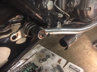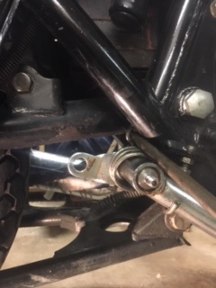 Photos of my rainy after noon project. Rear brake lever would not return and stop light was on so took the right foot peg off and nut holding the brake lever on its axle. Here is a long screw driver trying to pull back the return spring from the frame bracket.