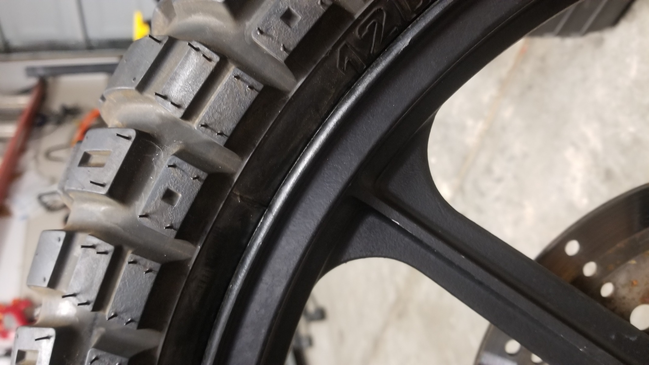 The first picture is on my africa twin. You can see the line around the rim, which I though was a mark to show the bead has properly seated.