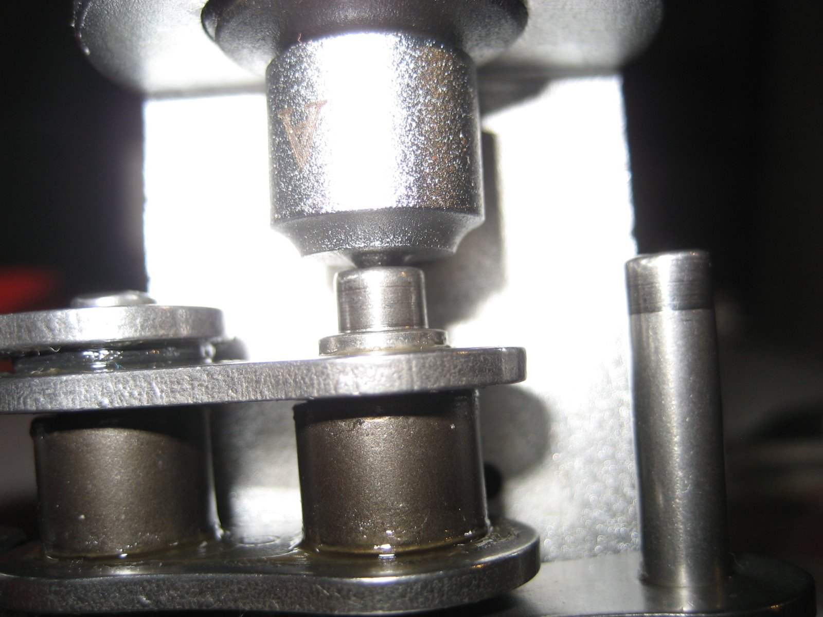 I would second and third Zed's advice. it used to be a "thing" to find dead sporty's with cracked RH cases from the chain link coming out and the chain wrapping up on the front sprocket, breaking the case. Although it looks like you are already on the right path with the rivet tool, the 4 point stake is really not necessary IMHO. This is my EK 630 SRO chain with hollow rivet link. Done deal. (the second time around on the link). A little learning curve adjustment was necessary.