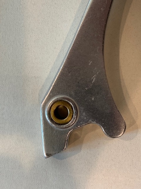 My brake lever is a bit different from the ones already pictured. It has a wider bronze bushing that is apparently pressed into a bore within the lever itself. At some point I may take the bushing out of the original brake lever and bore a reception hole in the replacement lever and insert the bushing in that lever. Should not be a big deal if I can find the proper size reamer for this job. See attached picture for my original lever and note the bushing size.