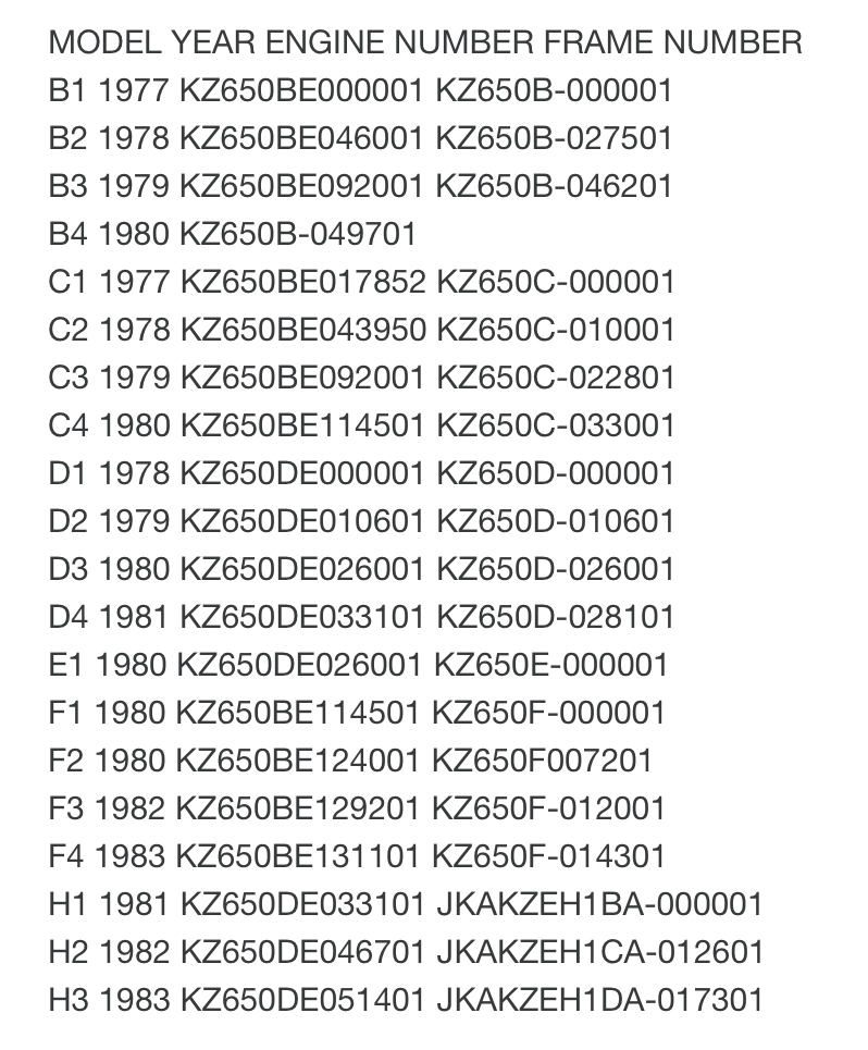 27 Jul 2020 07:13Ninja1195 wrote: My KZ650 is a bit of a mystery to me. The frame sticker says 06/78 and it has the spoke wheels too. The papers that go with it (same VIN# mind you) show it as a KZ750 1979 .