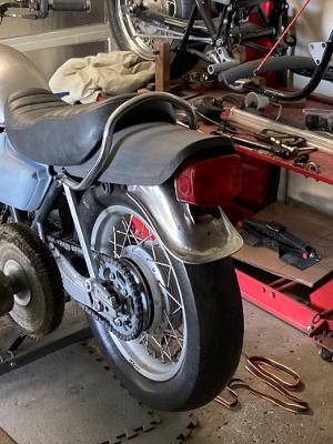 Hi Matt! Forgot to mail you. Bar came and is so nice, I'll leave it chrome. But? Yes for the Red Neck Engineering? I'll give them credit! The cut lines were nice and clean! :laugh: I got this simple look going. I am going to take apart and rake frame this winter. Plus, paint before winter sets in. I put another $20 1978 KZ400 18" rim for front. Did another disc project. I took the 1C rotors I had and ground them down to 5mm from the single 7mm. size. Ben Beasly ( He still makes fiberglass parts) sent me an old school Z1 18" drag bike fender! Stuff all looks good together, I cut back the tail light bracket in 1/2 and re-welded it to tuck in. And My luck! The way the sprockets are! The bike came with a 13 tooth counter shaft already! I was going to downsize it. Already was. 4 gears in the 1/8 mile! The chain adjusters are all the way forward tight! I'll have to down the rear to take advantage of that extra inch of swing arm. Thats what I wanted the GS arm for to bring wheel back a little more. I'll take care of it. Here's a couple pics. Sorry to babble on!