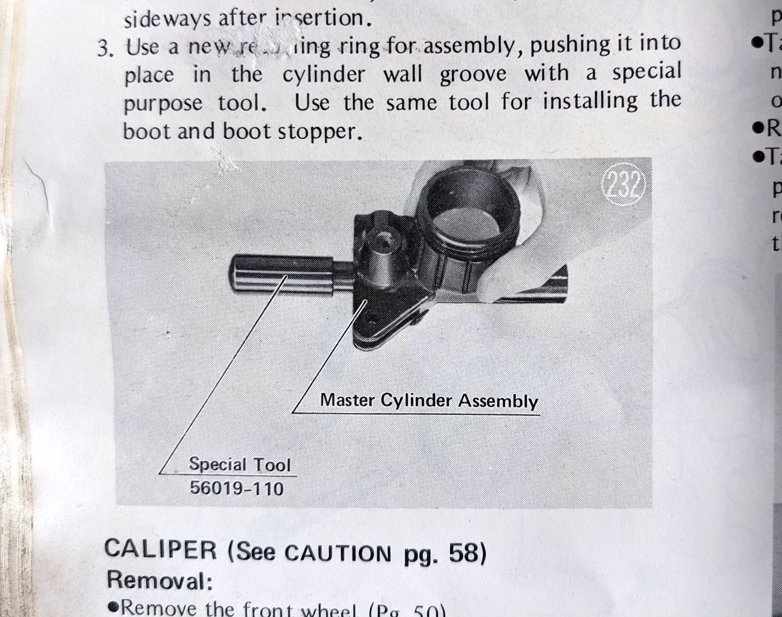 I'm working on assembling a 1974 Z1 front master cylinder. I wanted to make sure I install the various retaining rings in the correct order. Also, the manual shows a special tool for this purpose. Any advice on a substitute for this tool?