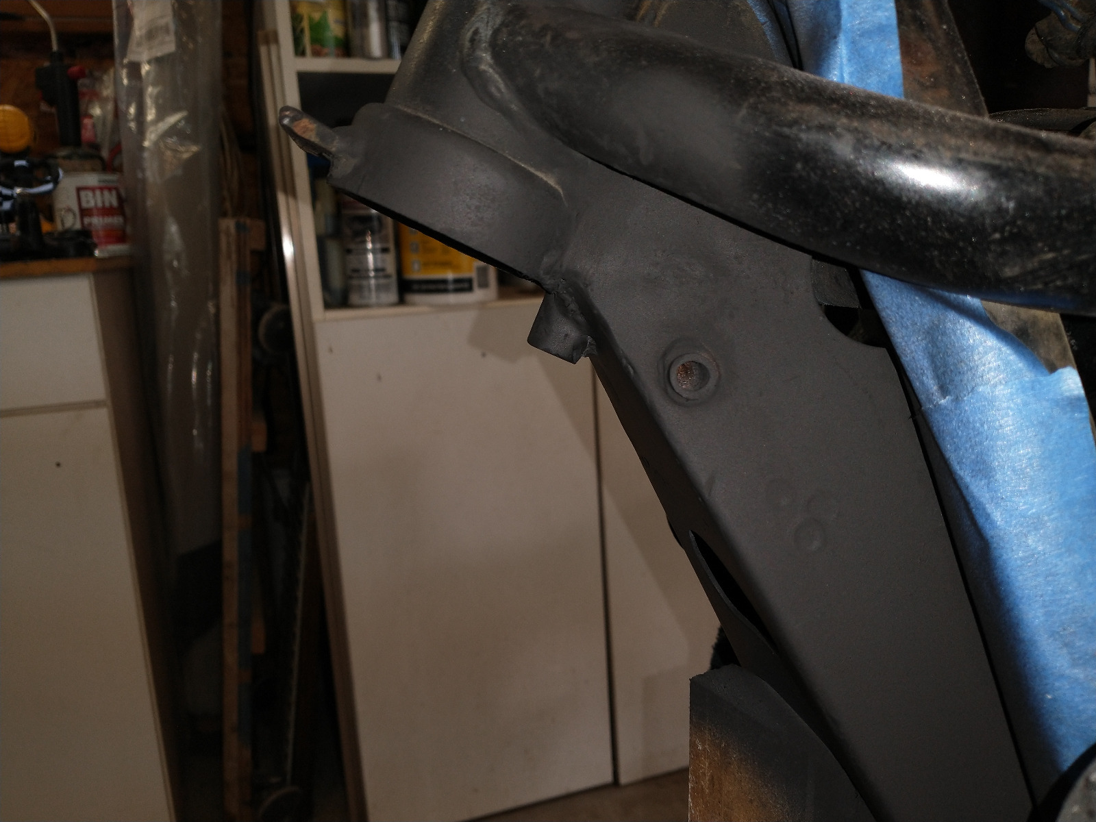 I know, The pictures suck, but there is more to come. I cut a triangle shaped piece out of the gusset, Took out the pin(it was almost already free) and ground off the old welds, and tacked it back in place. At least it wasn't perfectly centered! So then slightly thicker metal around the pin and presto!
