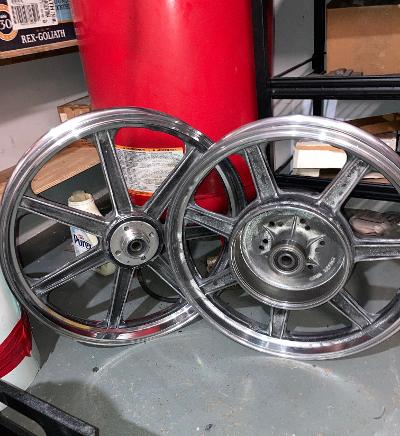 I have a titled 76 KZ900 frame. With nice polished front end, a dual disc brake set up. I have dual disc's for the Lester also. Figure I'd put these wheels on just to roll it around. Take it off the barn job milk crate & HF wood dolly