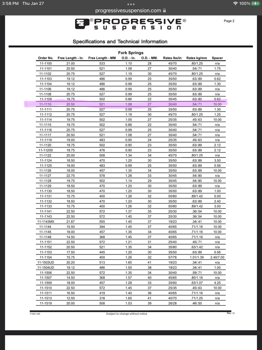 Guessing at some numbers, I came up with 0.95kg/mm which is the same as the number Mikaw mentioned, and the Race Tech springs come in roughly the same range (0.8 to 1.0) as the springs offered by Sonic. It could be that the Progressive table you posted is assuming that you would still be supplementing the spring force with the air pressure system.