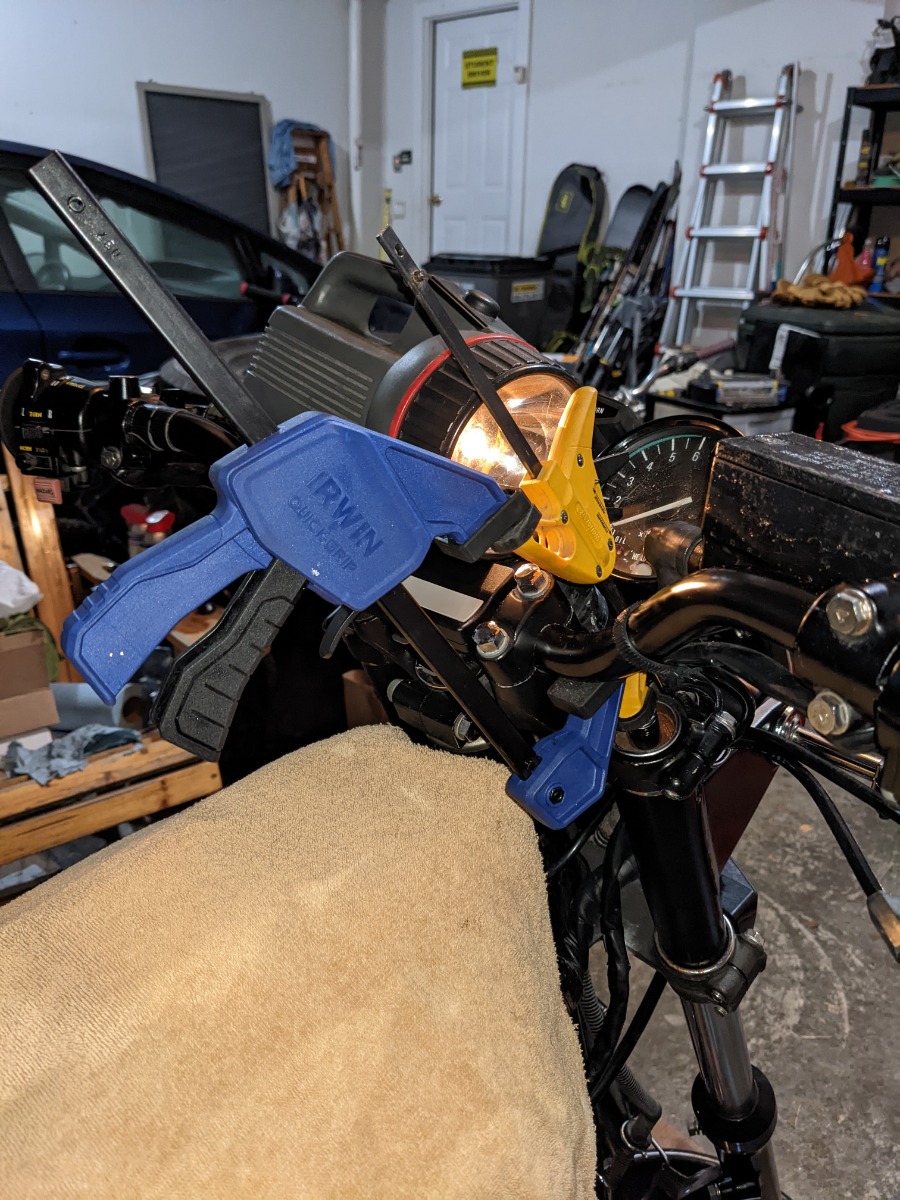 The second plug ended up being far more stubborn than the first. It was pretty stuck, and I was having trouble pushing it in to access the circlip. After a good amount of time and frustration, I came up with a novel solution that made the job much easier. First, I sprayed some PB Blaster and let it soak for a bit, then placed a small socket on the plug, over the air valve. I then grabbed a couple of clamps, flipped the smaller clamp so that it would exert an outward force against the socket, and braced the larger clamp against the underside of the handlebar. This gave me a hands-free way to keep the plug pushed in while I pried out the clip with a couple tiny flatheads.