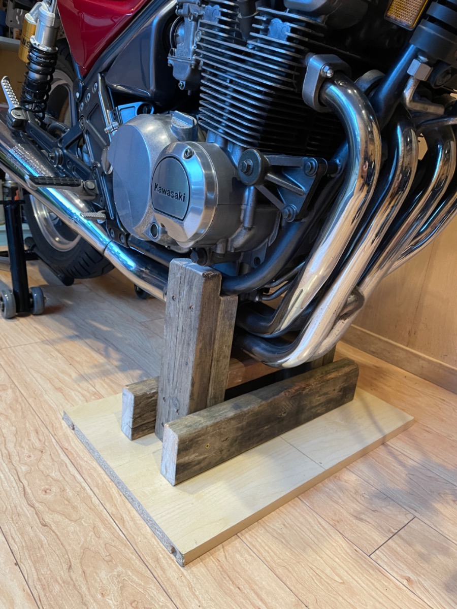 Made this little overbuilt 2x4 stand to hold the front of the bike so I can take the lower triple out for measuring.