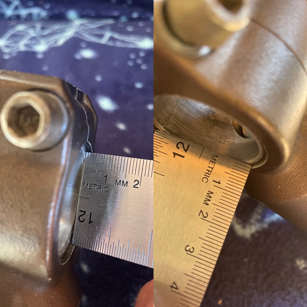 Back to the axle spacers, I think I can actually make the ones I already had made up work, but there's a weird problem. It turns out the counterbore on the left ZX6R fork is shallower than the right fork. Photo below.