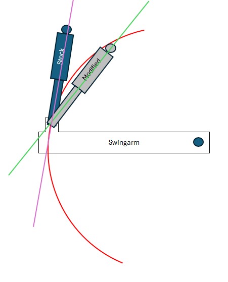 My understanding is as below, in the stock position the linear travel of the shock doesn't follow the "arc" the swingarm moves through so will create side loading in the shock (remember we are talking very small gains for racing, it's more a "replicate the factory racer look" on a street bike) With the top mount moved forward the linear travel of the shock is better aligned to the "arc" the swingarm travels through