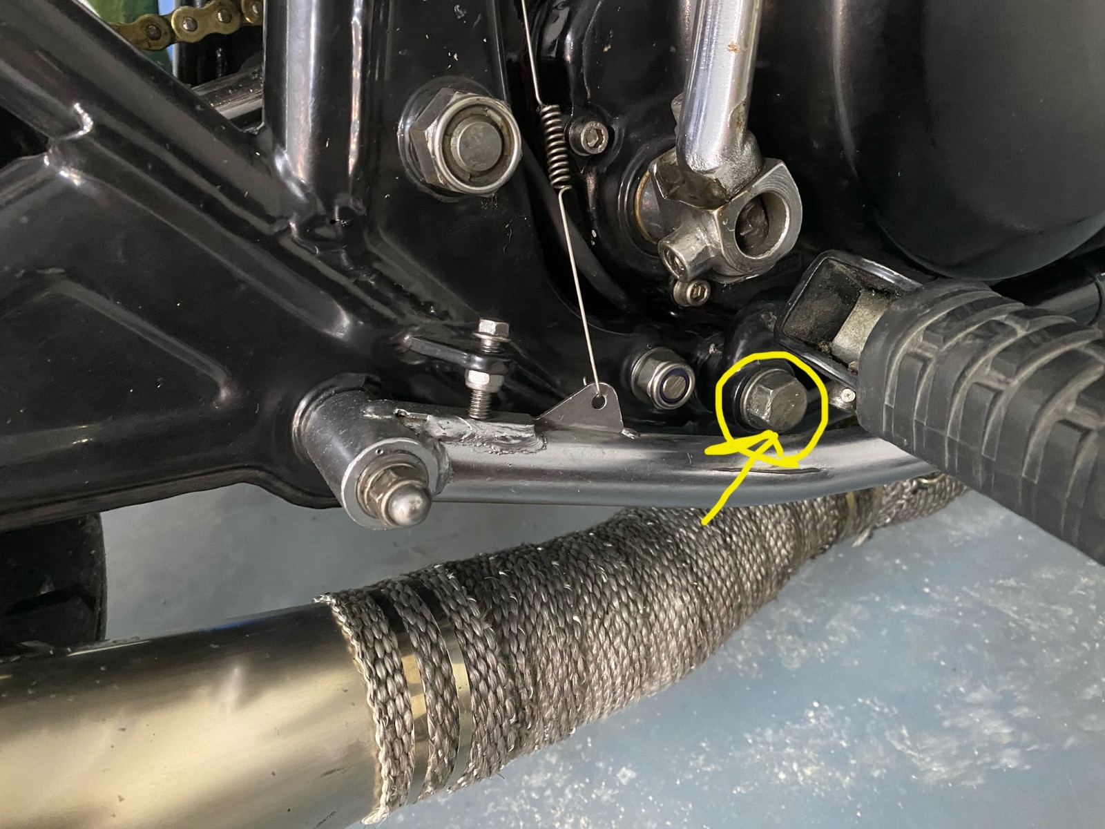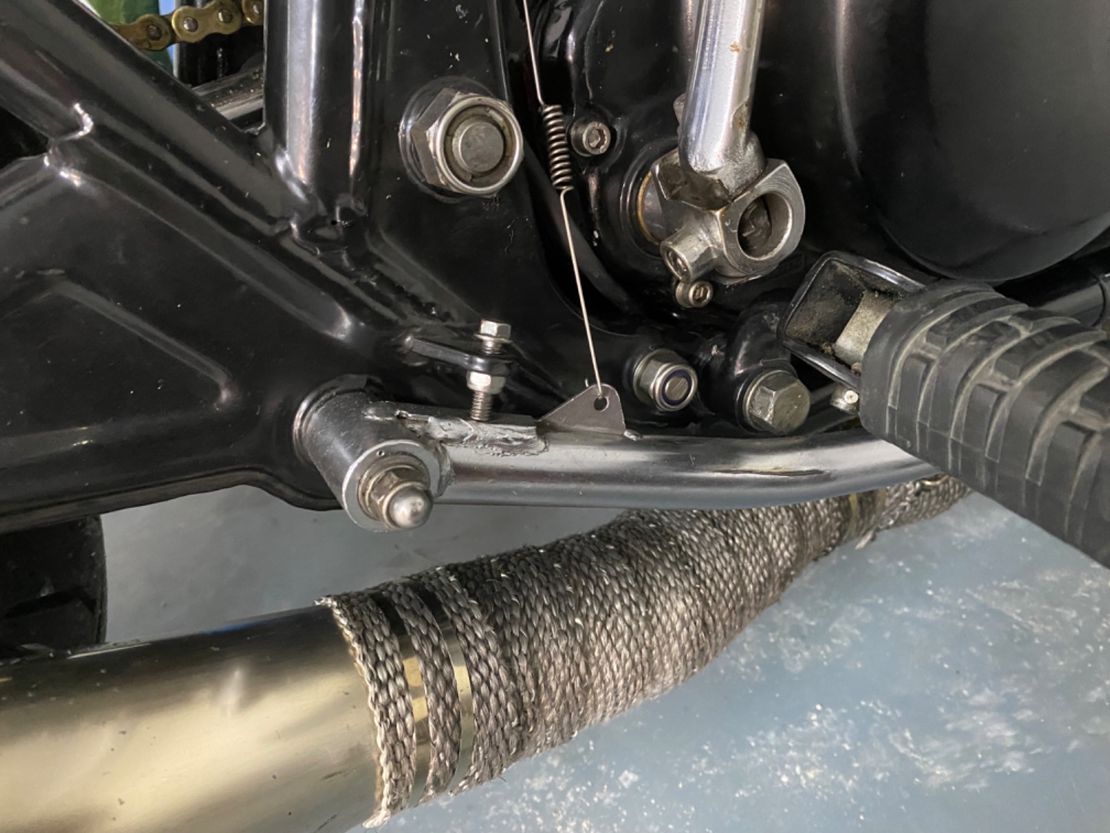 Here's a pic of mine to try and show how much clearance there should be between the pedal arm and footrest mount bolt.
