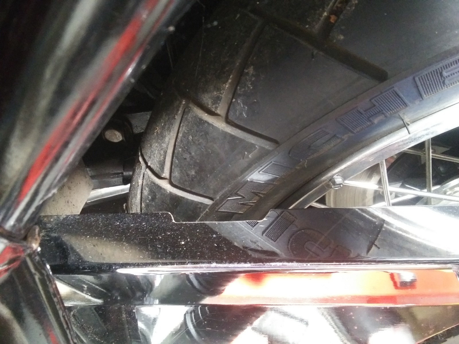 Fast forward to now and I'm building my KZ1000A. Located and restored the similar 2.15-19 front and 3.00-16 Lester wheels with Avon Roadrider Mk III tires, 3.25-19 and 130/90-16. But now the rear tire significantly rubs the chain guard.