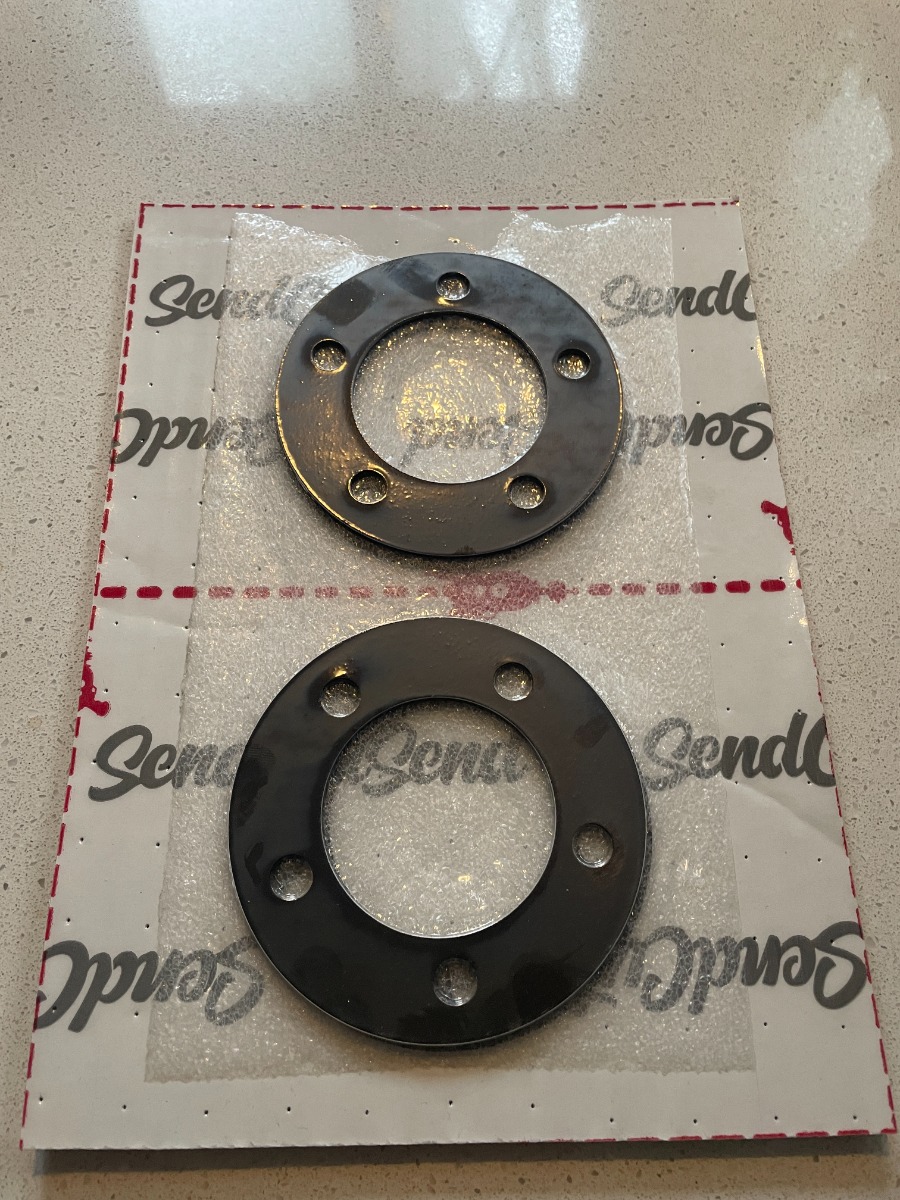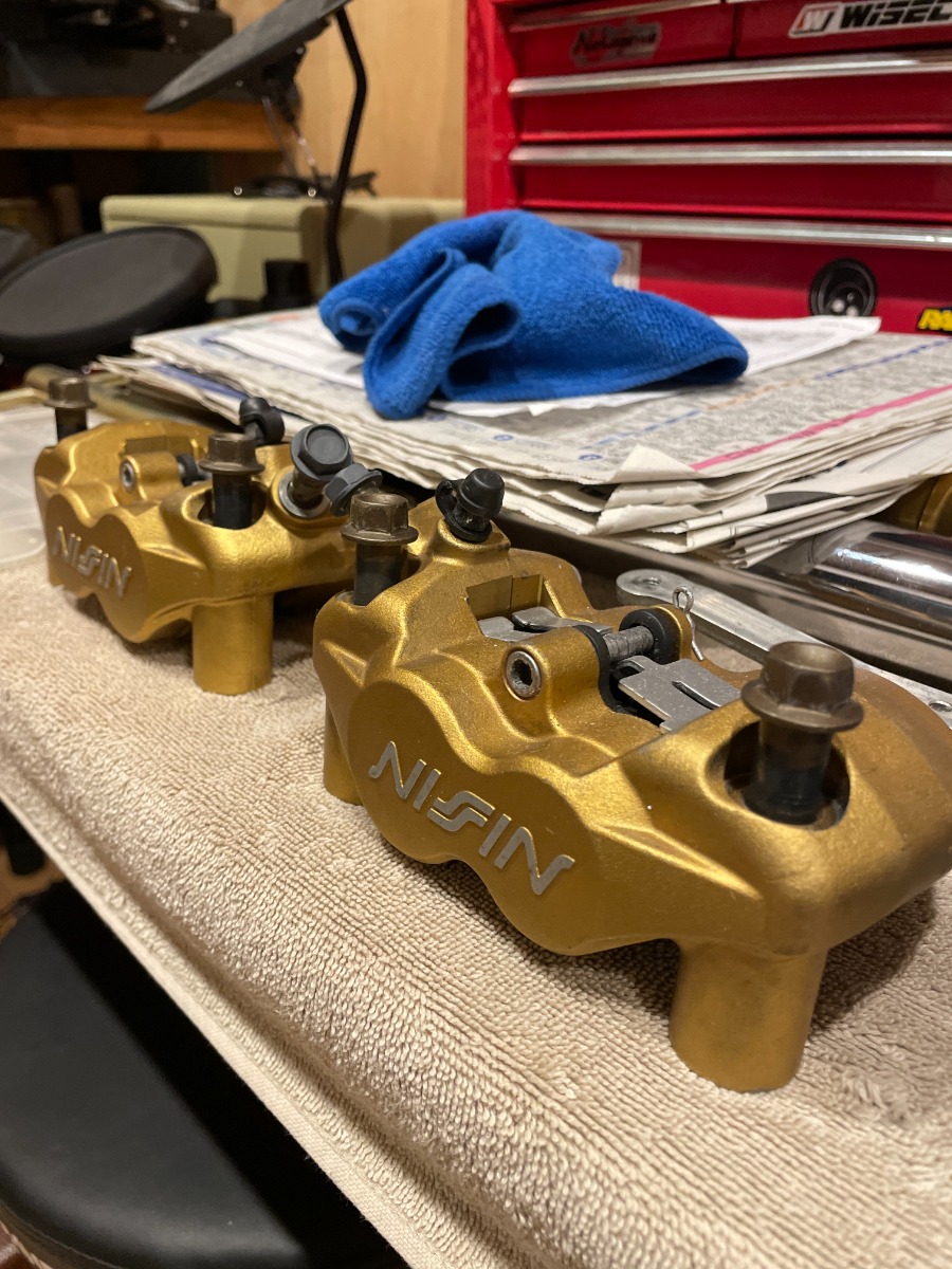 There were few off-the-shelf components that would make this a simple plug-and-play situation. I have sourced a custom axle from Spec Engineering in Japan via Webike, made custom rotor spacers via SendCutSend, determined that bearings, axle spacer, and speedometer drive from a ZX-600, and rotor bolts from a Suzuki would work, had a fully-custom left side axle nut made, and rebuilt the '03 ZX6R forks with (again, fully custom made) damper rod extensions. Here are some photos in probably non-chronological order.
