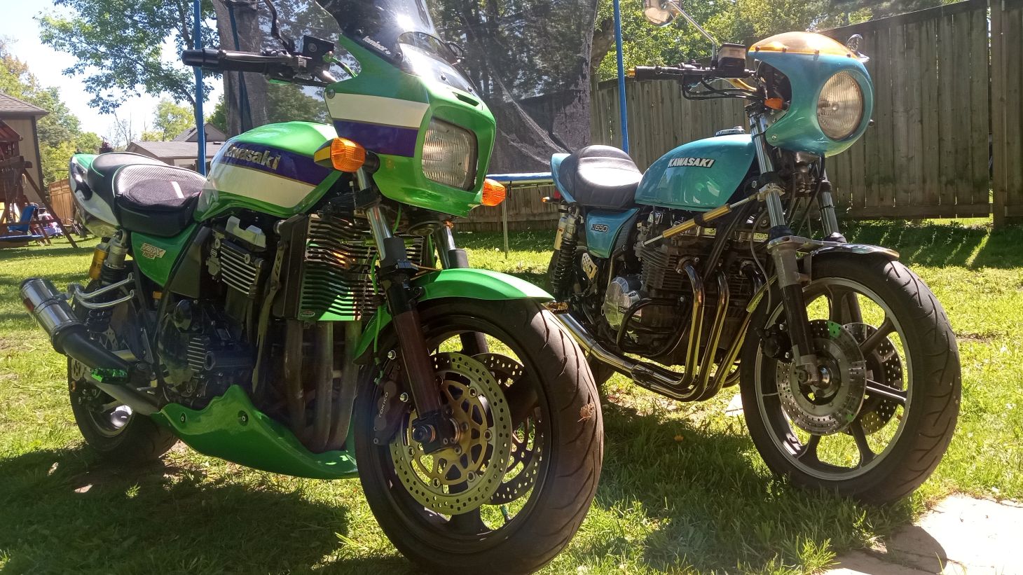 1978 KZ650 C2, 130K kms, Delkevic ex, EI, CVK32, PMC easy clutch, ATK fork brace, steering damper, braced swingarm, ZRX shocks, 18" Z1R front wheel.