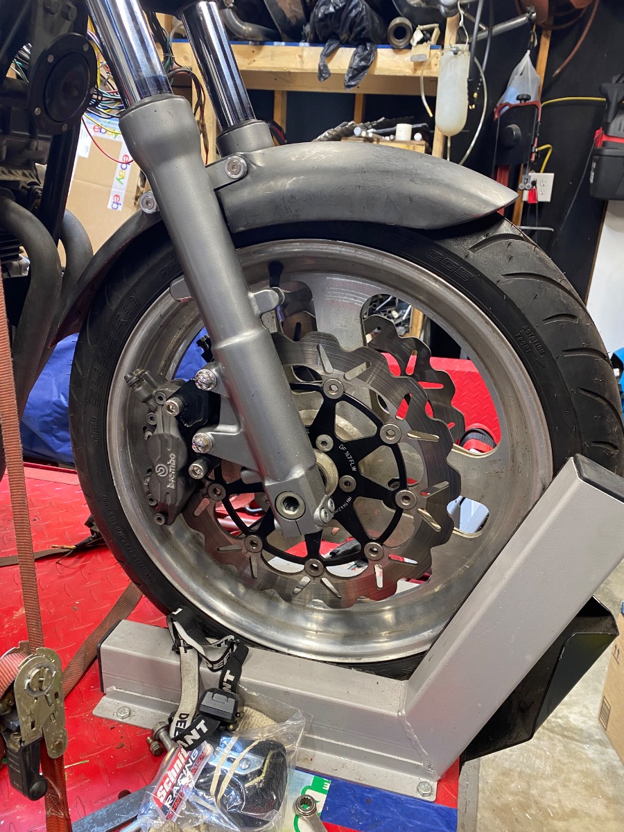 I am using a Zephyr 750 item with ZX9R forks. If you look back to page 20 something of my build you can see the mods I did to the brace and fender (not extensive)