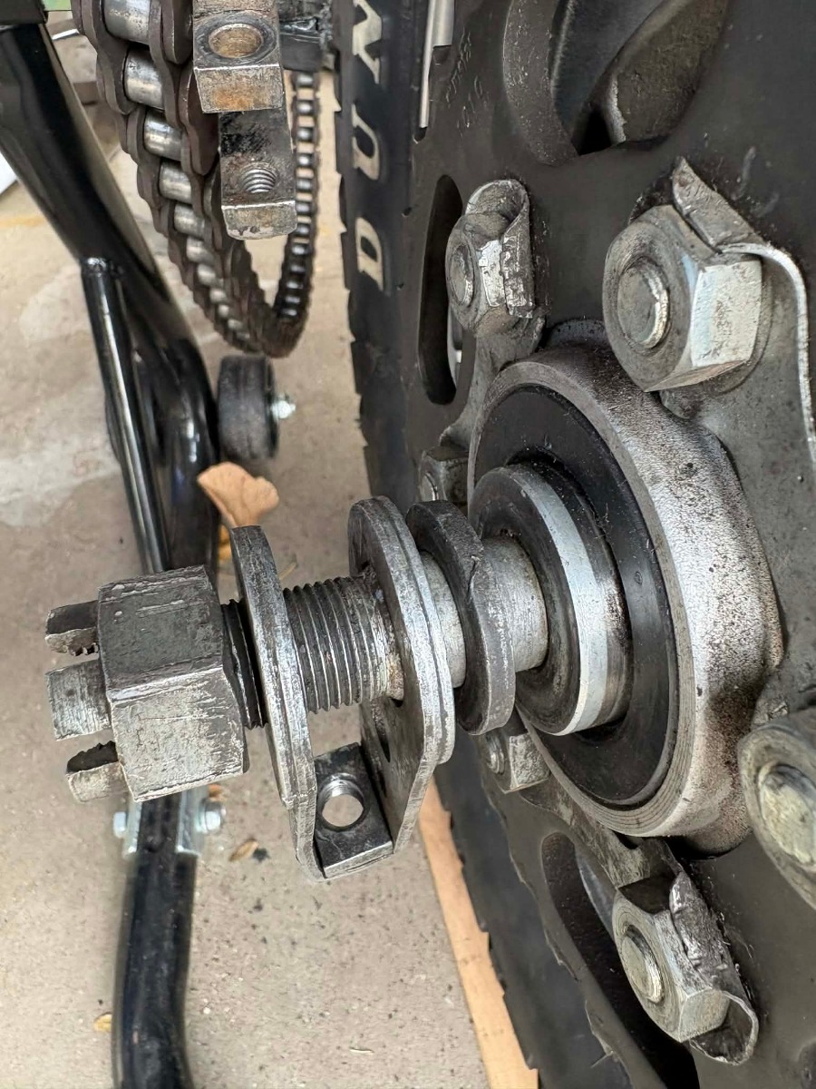 It felt impossible to get the wheel back on in this configuration, like there wasn't enough space between the swing arm's forks. So I wondered if the washer is actually supposed to go between the castle nut and the chain adjuster like so: