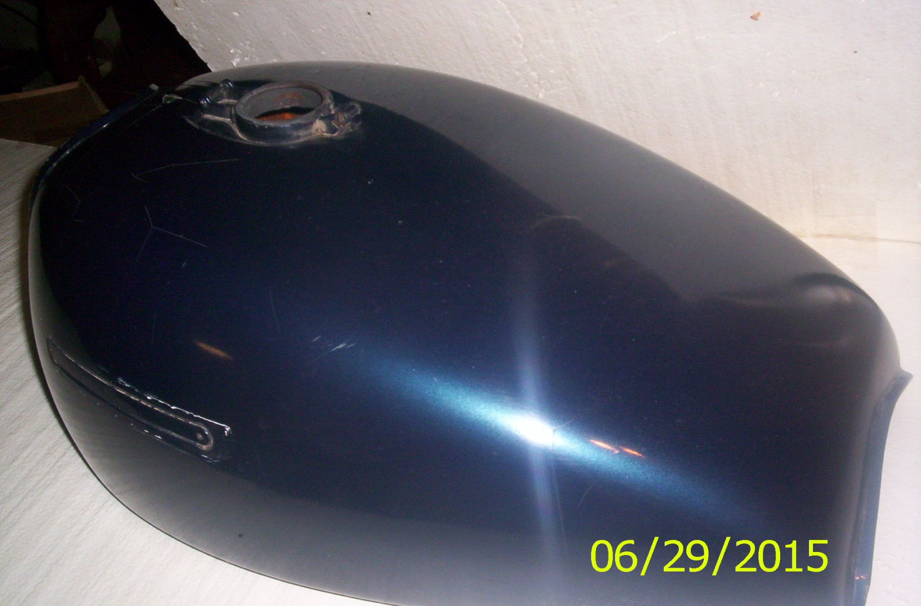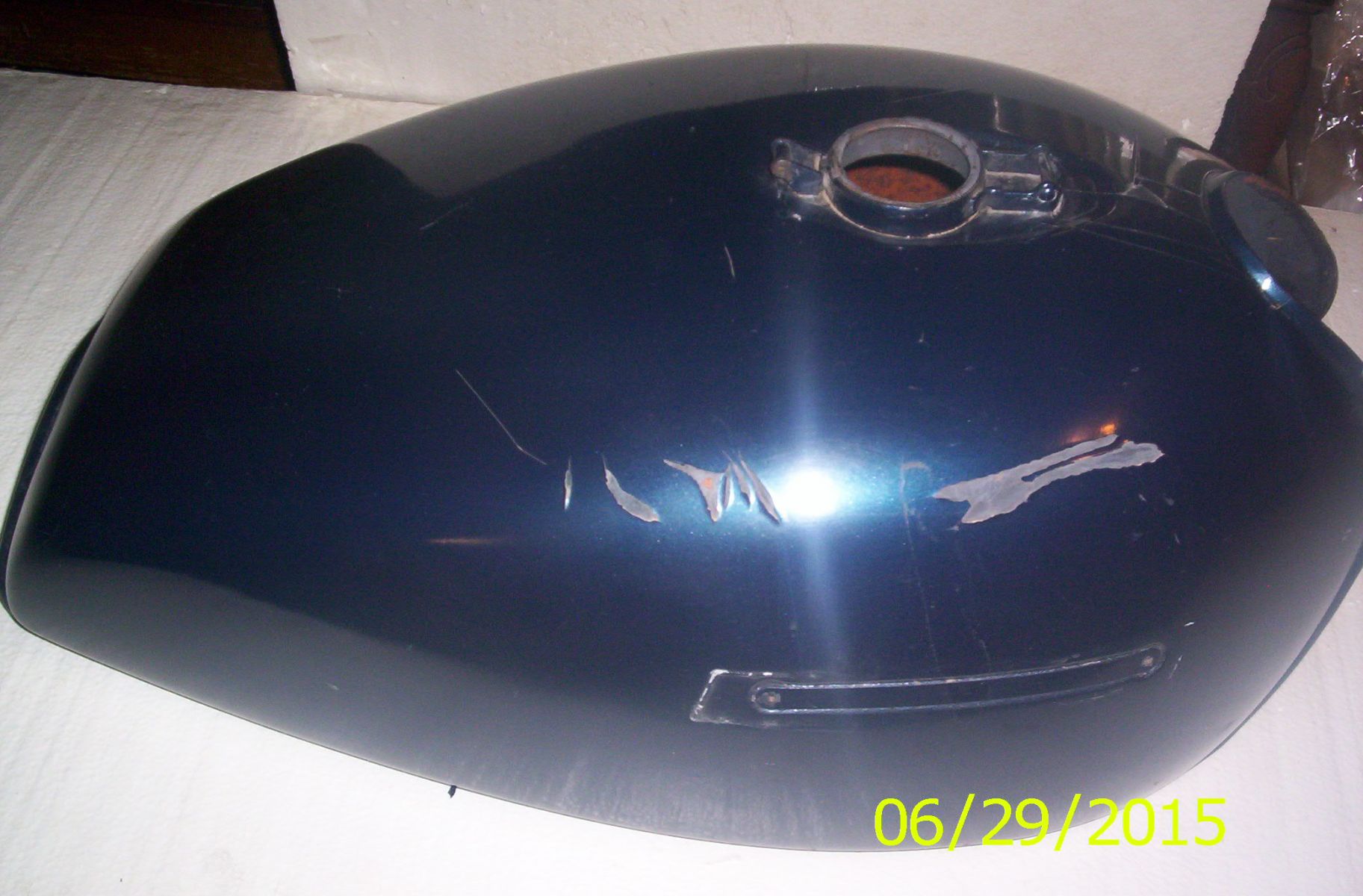 Two summers ago I prepped, primed, color coated until it matched my helmet and clear coated it with gas proof paint. It was beautiful. I made a lot of mistakes like, painting in the shed with the A/C on a humid day, opened the door and watched in horror as my color coat turned cloudy. Wet sanded it and painted it again in my daughter's spare room. Dust and SHT in the paint, washed out the shed, let it dry,waited for a dry day, finished the color and clear coat. I let it sit for 24 hours. It's done. Yeah some minute specks here and there but not noticeable, good enough. Proudly I took off my spare tank and put on my new beauty. God it looked good. Winter rolled around and I went to my daughter's for Xmas. They have a nice garage so I decided to clean and polish the bike. There was some grime on the tank so without thinking I used some glass cleaner. The next morning cracks started appearing, then big flakes of paint started coming off. I know you aren't supposed to use glass cleaner on plastics and that's exactly what I did. KICK KICK KICK. Expletives deleted.