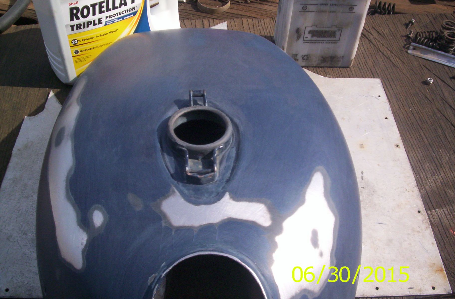 So now I have my spare tank on the bike and I will paint it. I'll touch up this one to use while I do it all over again. SHT.