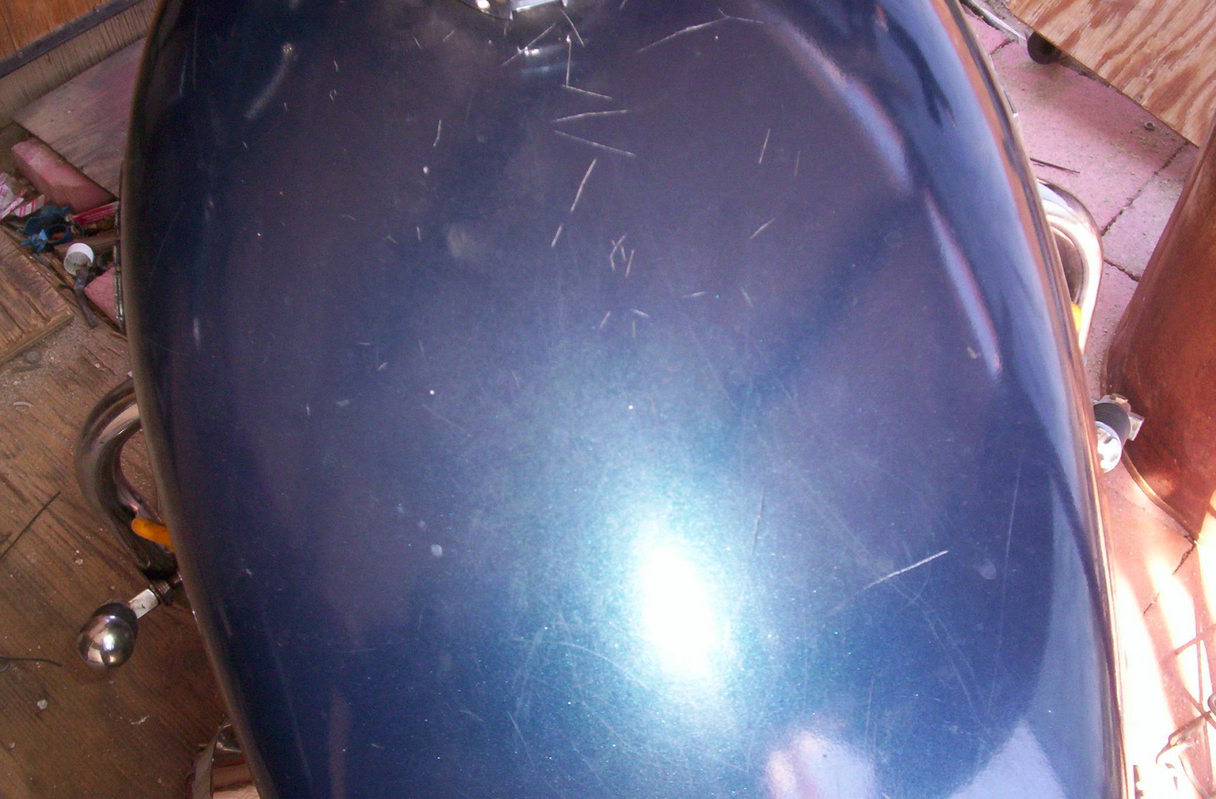 Taking my time I wet sanded it and took out the small imperfections. All was going well until I put on the clear coat. I guess I'll have to live with it while I strip down the other one. It has less dents so I'll try the freeze method to take them out. This tank has a lot of filler in different places, the paint was hard as a rock so I figured it would last. I figured wrong.