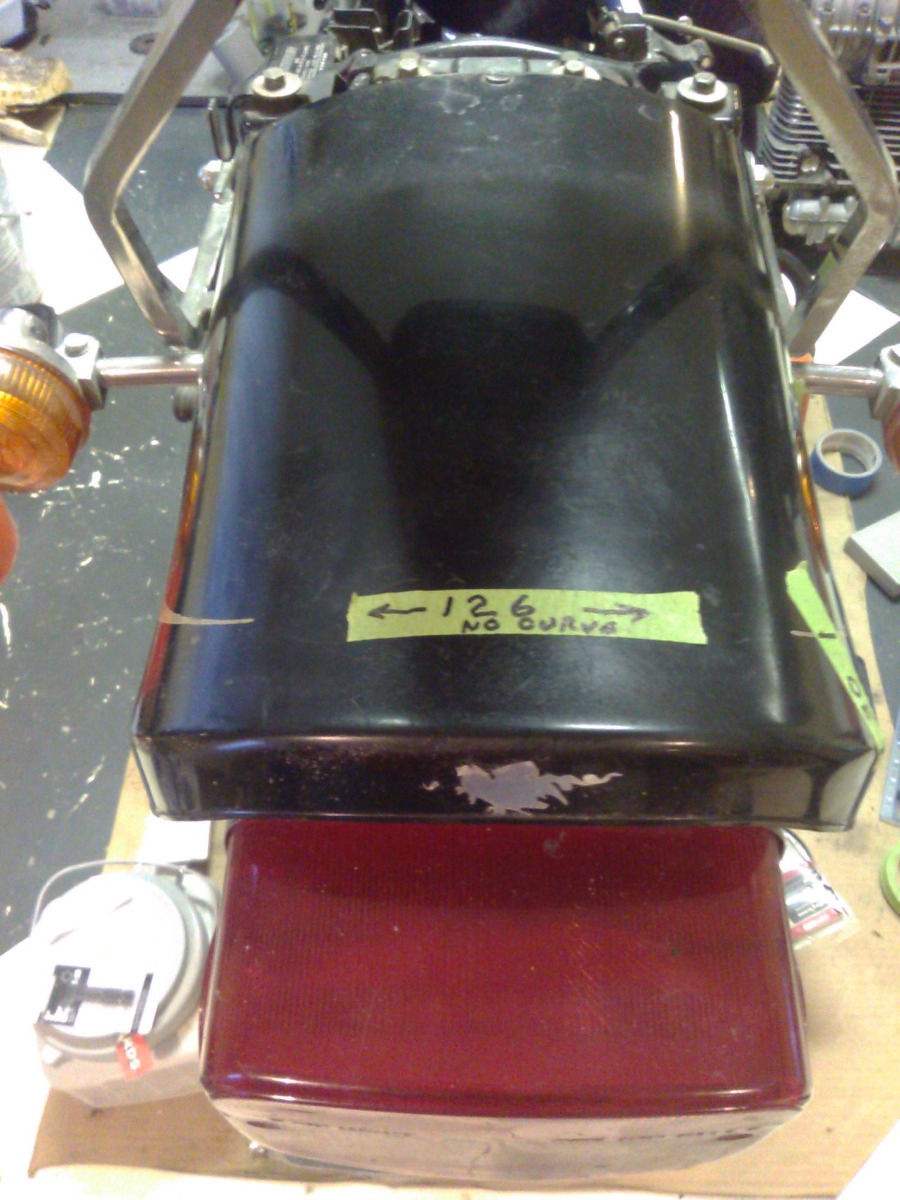 I honestly don't think any two pieces left the factory with the decals in the same place. Once I wet sanded my tailpiece I could just barely make out where the original decals ended. I also looked back at photos of the bike from last year before I stripped it, and the skinny decal vegan almost centered above the rear signal light stems.