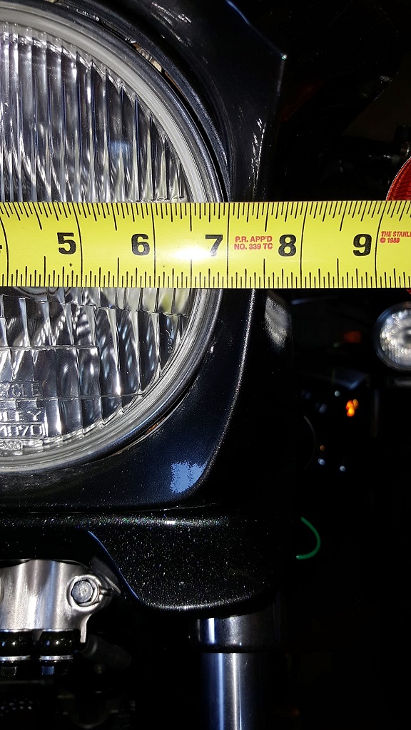 The Large Round Maier sport fairing # 00501 has a measurement of 8 3/4" from the inner headlight hole to the back of the fairing.
