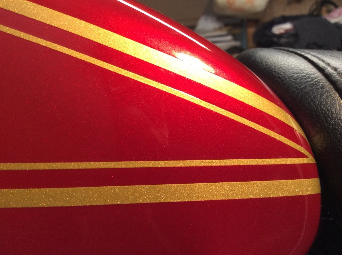 I painted my tank, side covers and tail with a red Chrysler color, put the stripes and side cover badges on and clear coated with the 2K MAX stuff. Finish is like a mirror and hard as rock. Gas resistant. Turned out pretty good.