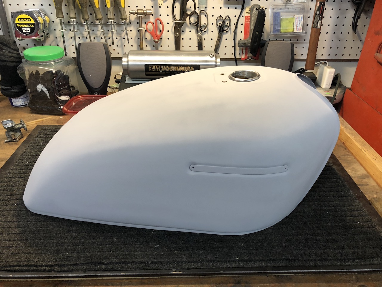 I stripped off the botched paint job all the way down to bare metal to find absolutely no dents or bondo. But whom ever painted the tank before I bought the bike used an aggressive flap wheel to sand the factory paint off and left deep sanding marks all over the tank. So I gave it a coat of metal etching primer and a single coat of filler primer that totally covered all but the deepest of scratches. It needs a lot more sanding and primer, but we have already gotten snow flurries up here, so my garage is too cold to apply more primer to get it perfect.
