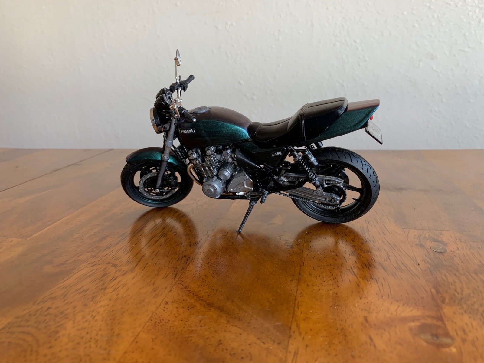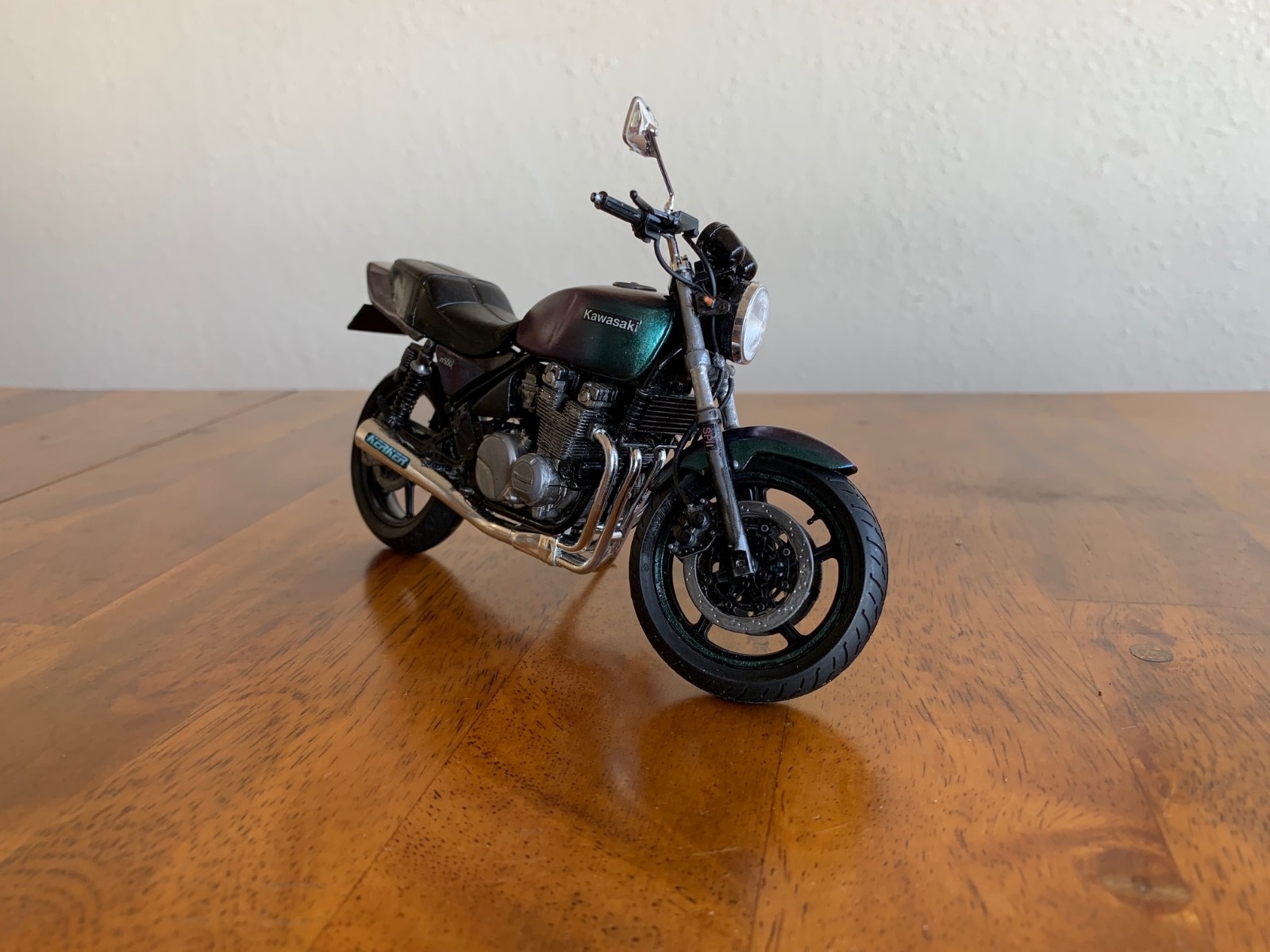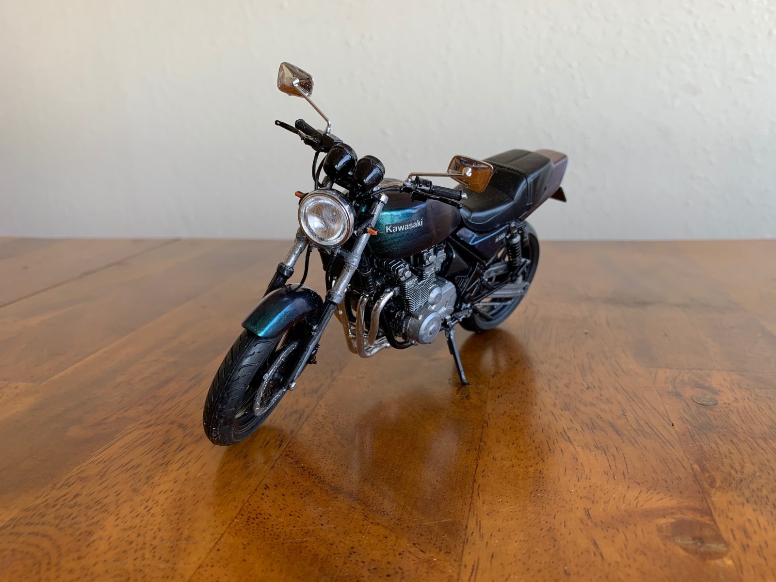 I was having a hard time picturing my bike in different colors so I put together a 1/12 model and have been painting that. Here it is in a blue/green/purple color shifting paint. Color changes depending on viewing angle. What do you think?