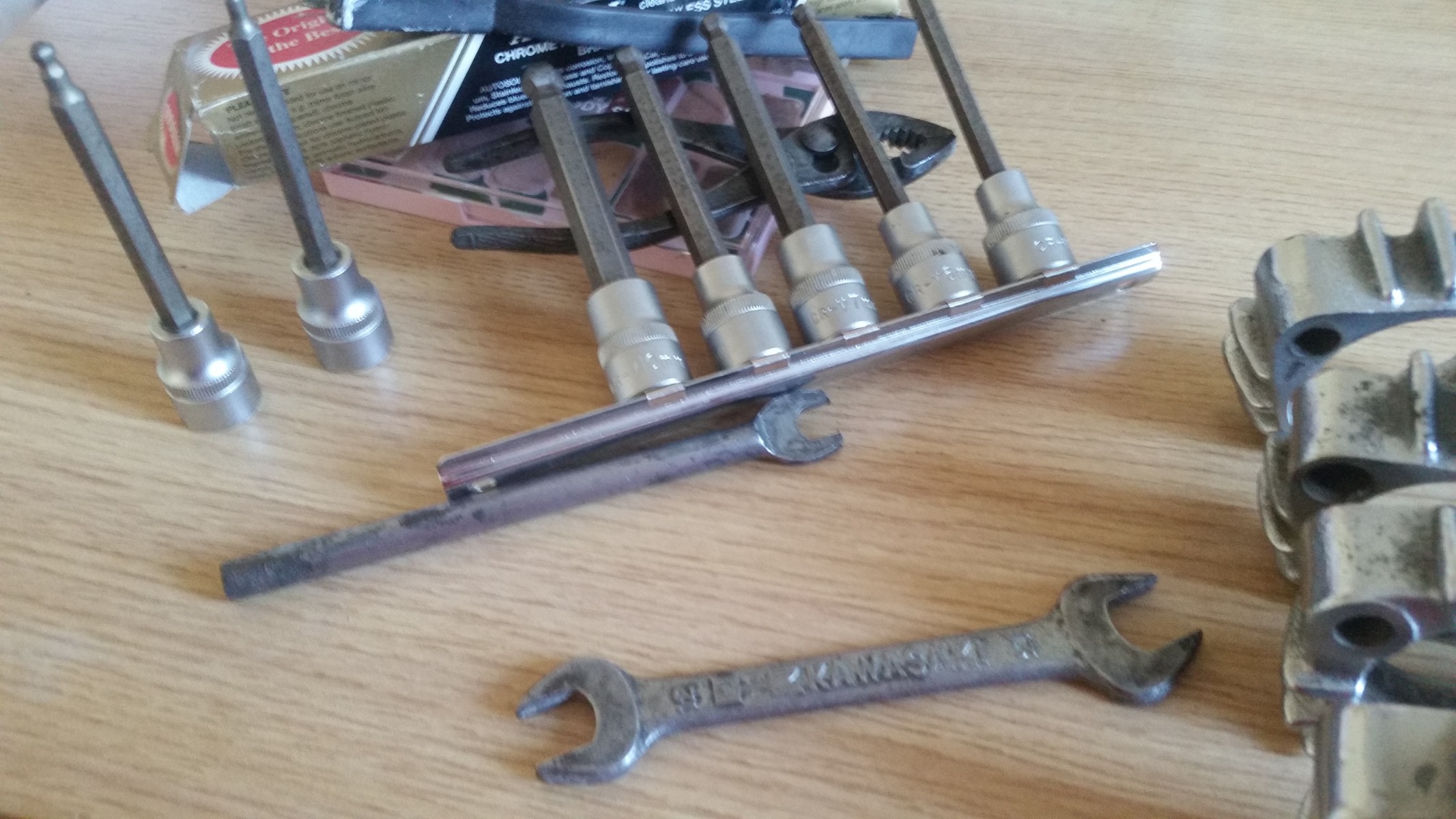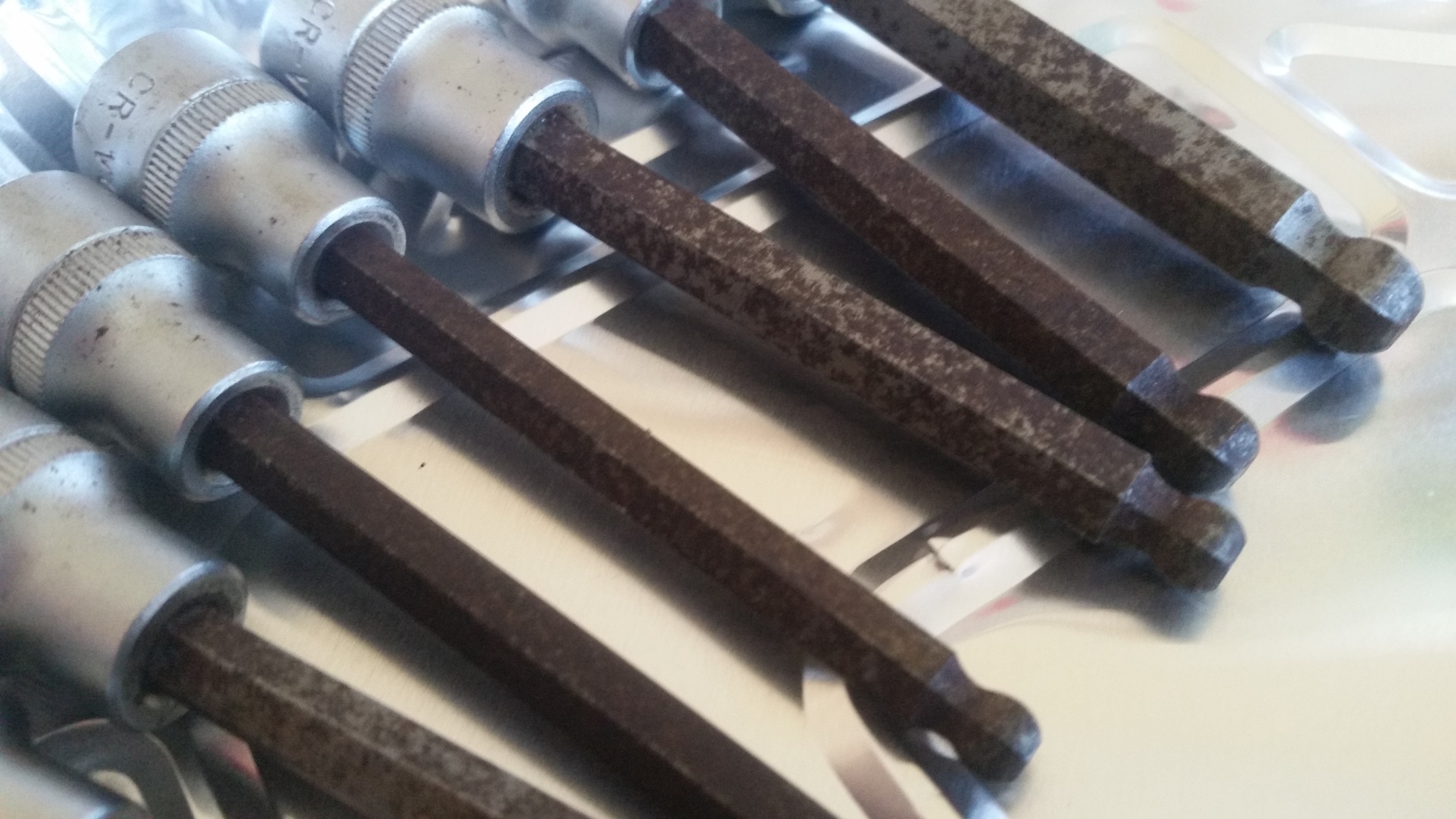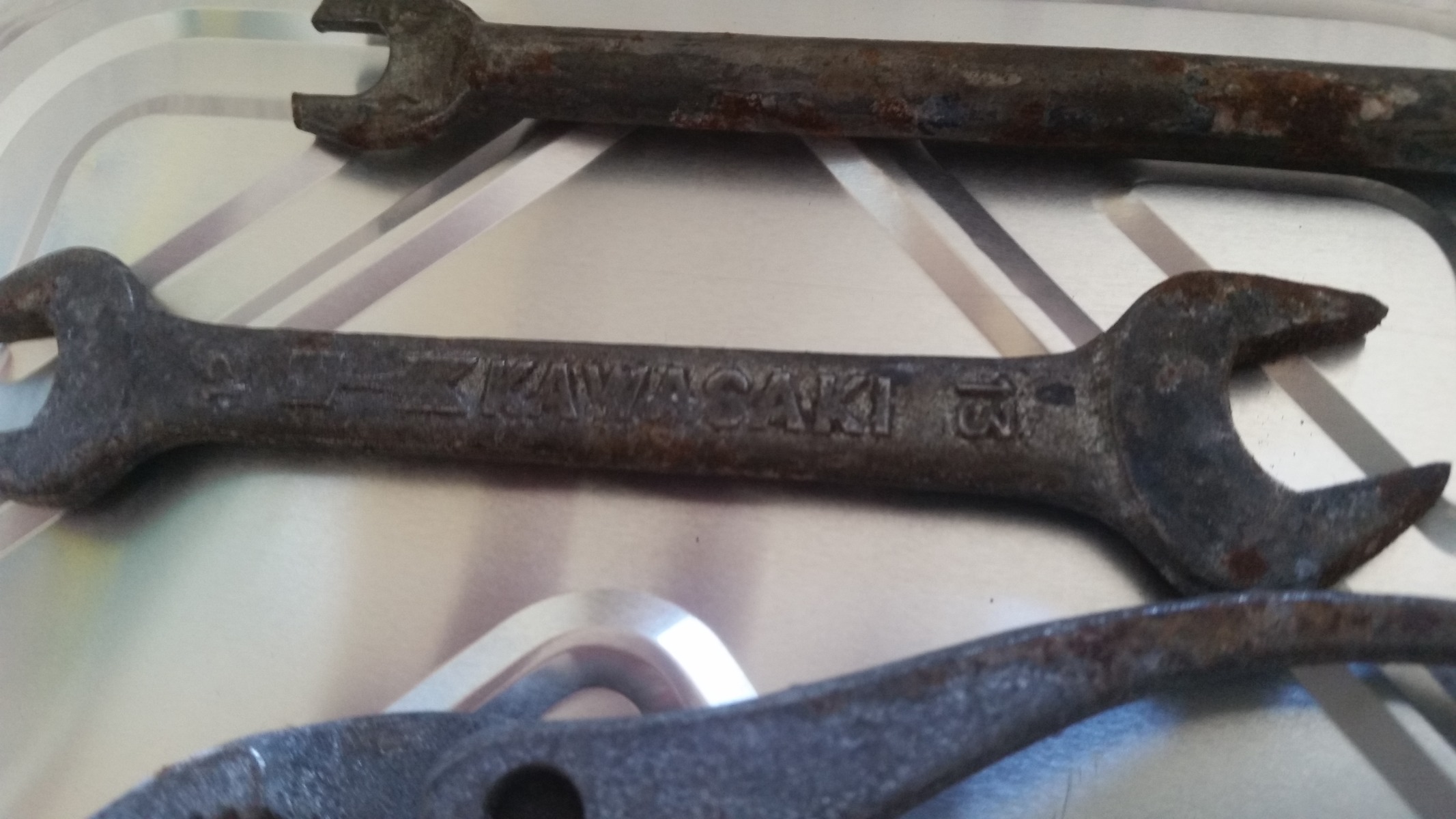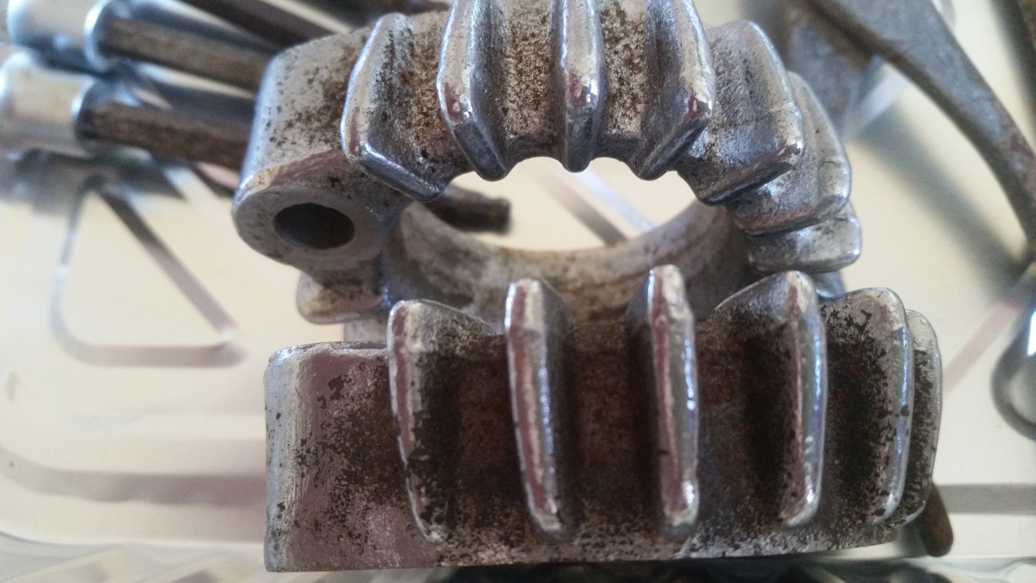 Hey everyone, I'm not sure if this is the right kind of section. ..anyway I had an hour free today and I've been thinking about how most toilet bleaches are up to 47% hydrochloric acid and I wondered what it might do to a few rusty pieces so I set up a foil disposable bake tray, gloves ,glasses and a cheap tooth brush and started scrubbing the bits with bleach! Here are the before pics.....