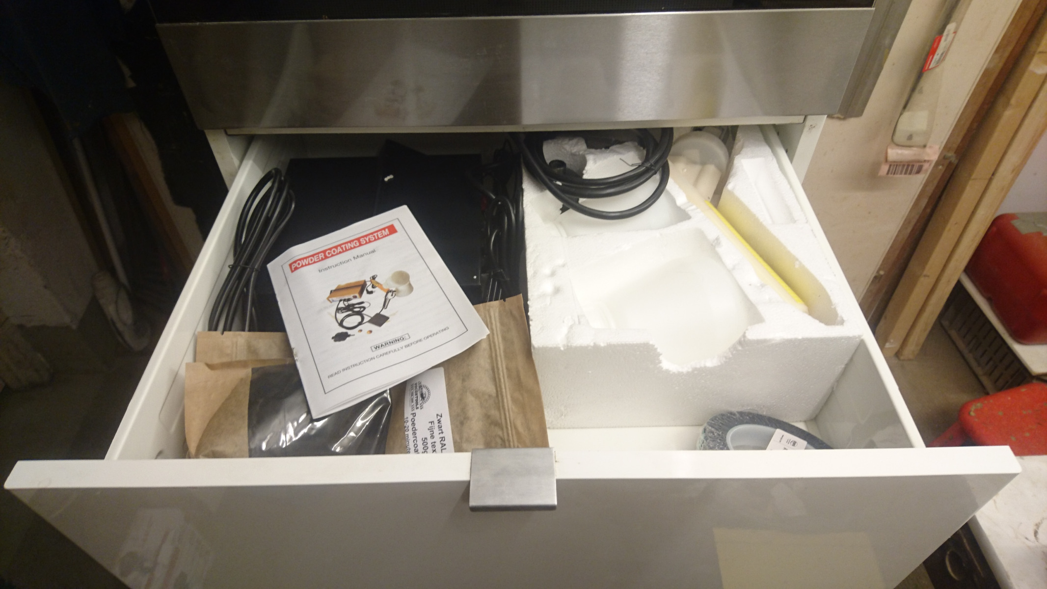 I bought a powdercoat kit off Amazon a couple of weeks ago and this week I started reforming a house in town. The kitchen was going in the garbage so,I now have a dedicated powdercoat oven. A couple of hours in the workshop with a set of wheels and some offcuts.......