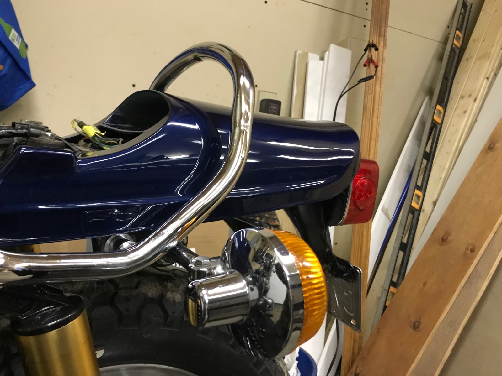and the paint work ., i wanted the luminous blue thats on mk2 and got this color ,what do you guys think? i love it theres also a pic of the bland light grey of the bike when i picked it up . i also tried my hand at pinstriping . havent decided yet if ill do it and clear it over