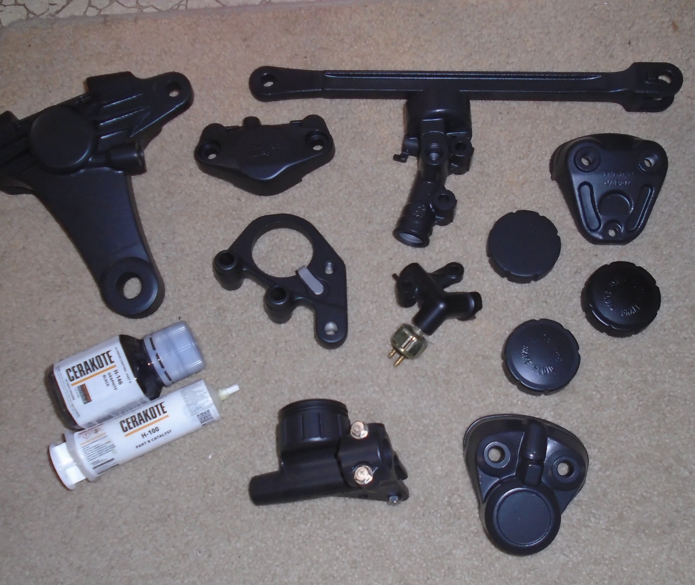 The first project I ever tried Cerakote on was a set of brake calipers. I was rebuilding my bike after an accident, and accidentally stripped the original paint off the calipers with acetone while attempting to clean them. I originally bought some VHT caliper paint, but then stumbled on Cerakote and got curious. I figured there was a chance I could use it and cure them in my normal household oven. So I actually called them up to ask some questions. I explained the situation and their rep said that their C-Series was perfect for brake calipers, and there was no need to bake it at all. Those brake calipers have been on my bike ever since, and still look great.