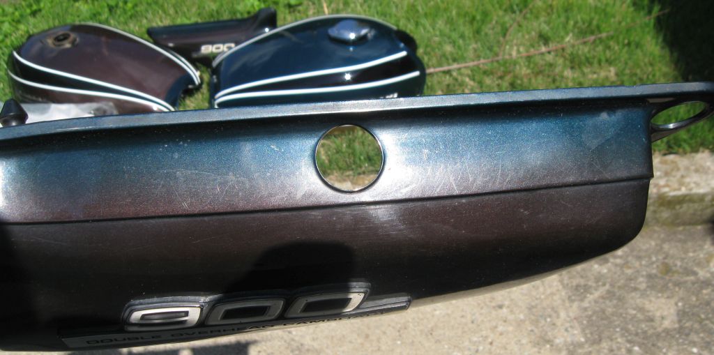 The tank on the right with the good, solid Candy Suiper Blue is from a NOS Kawasaki tankset circa late '70's ~ early '80's offered by Mama Kaw as replacements for the then-still-young Z1-B.