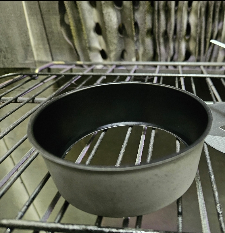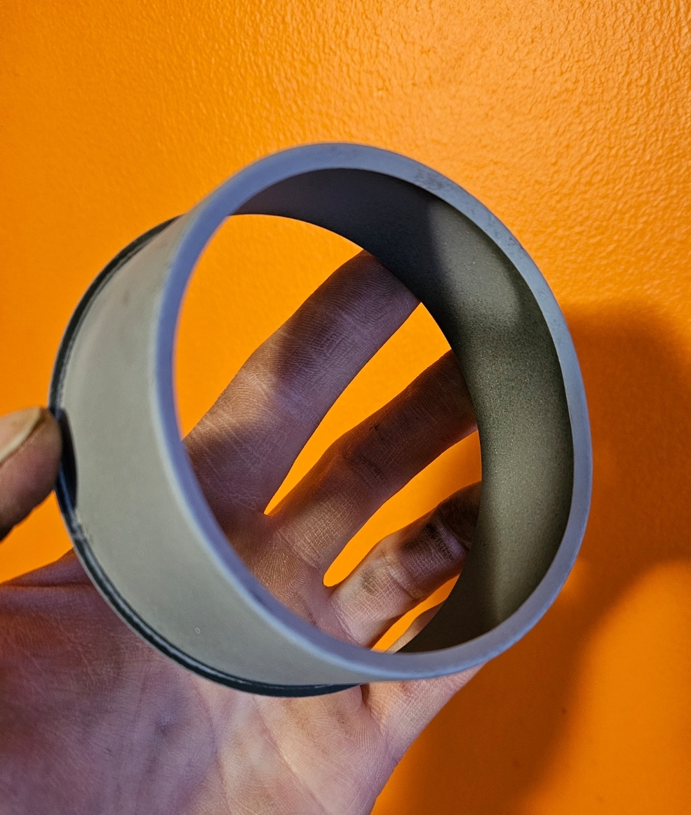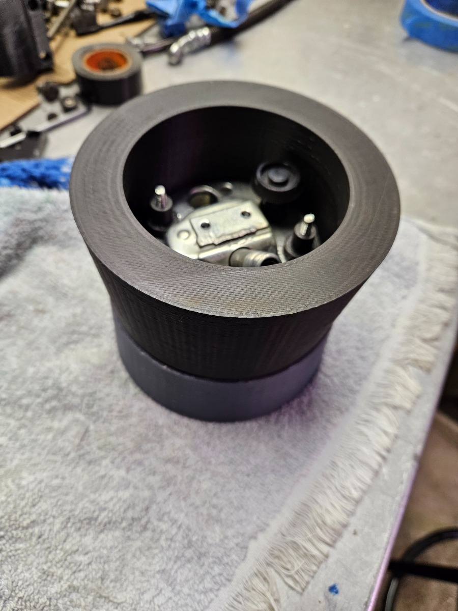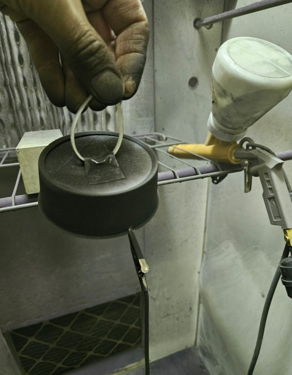 I glass bead blasted the front shell, painted the inside, baked it at 200°f for 15 mns. Then used a 3D printed 90mm x 2mm paint mask to suspend the shell while I powdercoated it with some gloss black.